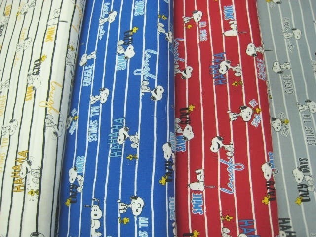 定番人気のスヌーピーのボーダー柄。いろいろなスヌーピーの表情がかわいいプリントです。 生地は薄手のシーチング生地。カバーなどのインテリアや、雑貨などの小物やバッグなど、様々な作品にお使いいただけます。