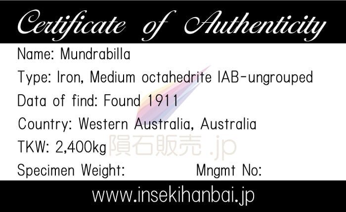 総質量は約24tでマンドラビラの主質量である12.4tの塊は西オーストラリア博物館で保存されています。隕石はMundrabillaと命名され、2013年の時点では世界で11番目に主質量が大きい隕石として認識されます。また、2018年3月にはマンドラビラの主質量である12.4tの塊からインジウム、スズ、そして鉛の合金のように見える極微量の極低温超伝導が見つかったことが報告されました。