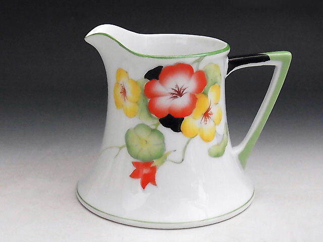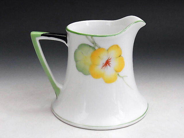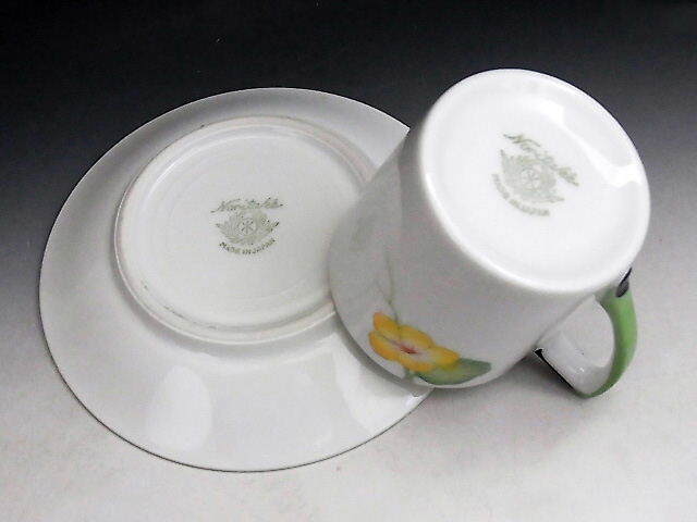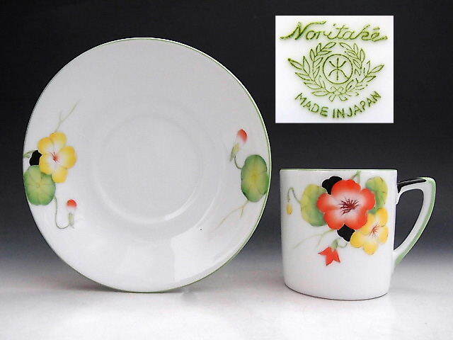 淡いグリーンの縁に描かれた二色の花をアールデコ調にアレンジしたオールドノリタケのデミタスカップ&ソーサー5客セットです。 揃いのクリーマーも無料でお付けいたします。 状態はすべてほぼ完全美品です。 年代は昭和初期戦前のオーストラリア向け作品です。 大きさはカップの直径が5.2㎝、縁からの高さが5.4㎝、ソーサーの直径が11㎝ あります。 送料は3000円頂きます。 支払いはYahoo!かんたん決済、または銀行振込みでお願いします。 日本以外への海外発送も承ります。 ご入金確認後支払2日以内にアメリカより航空便でお送りいたします。 発送後通常4~10日でお届けいたします。 複数品落札の場合は送料をまとめて計算させて頂きますのでお得になります。 私共は経済産業省の定める特定商取引法を順守しております。 当方の所在地住所等は出品者の自己紹介情報欄をご覧ください。 ご質問等ございましたらお気軽にお問い合わせください。   他にもオールドノリタケを中心に沢山出品しておりますのでここをクリックしてご覧ください。