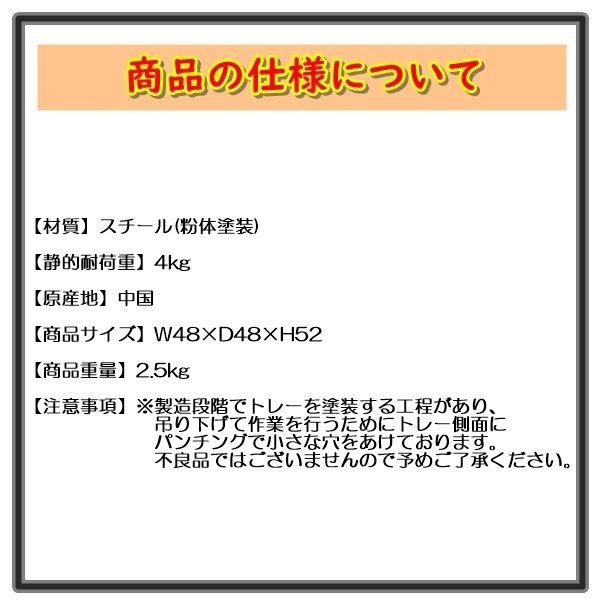 ![]() トレーサイドテーブル TST-880 グレー ◇◆商品の仕様について◆◇ 【材質】スチール(粉体塗装) 【静的耐荷重】4kg 【原産地】中国 【商品サイズ】幅48×奥行き48×高さ52(cm) 【商品重量】2.5kg 【注意事項】※製造段階でトレーを塗装する工程があり、吊り下げて作業を行うためにトレー側面にパンチングで小さな穴をあけております。不良品ではございませんので予めご了承ください。 ◇◆発送について◆◇