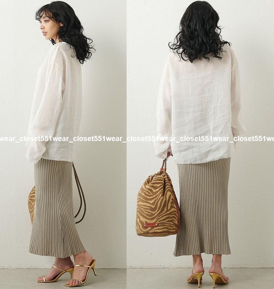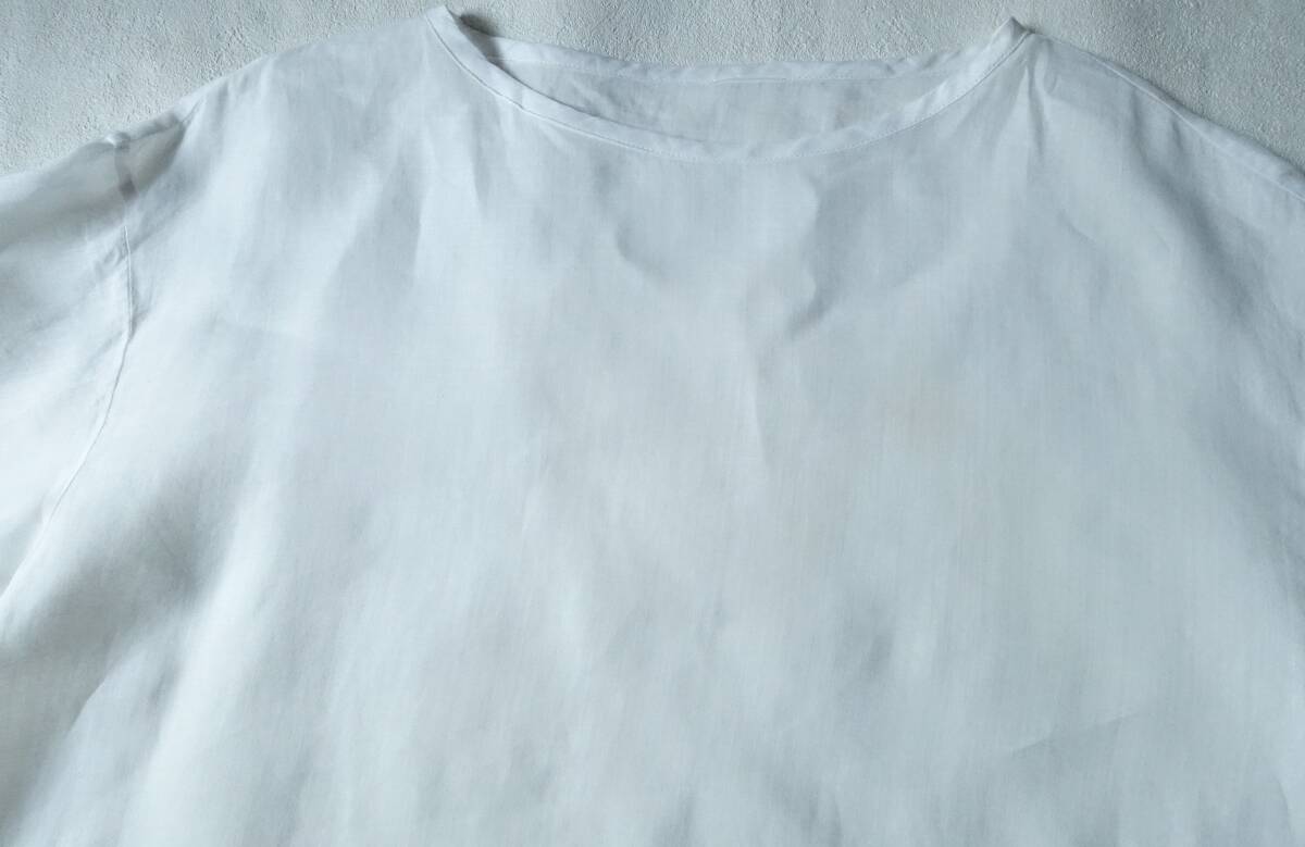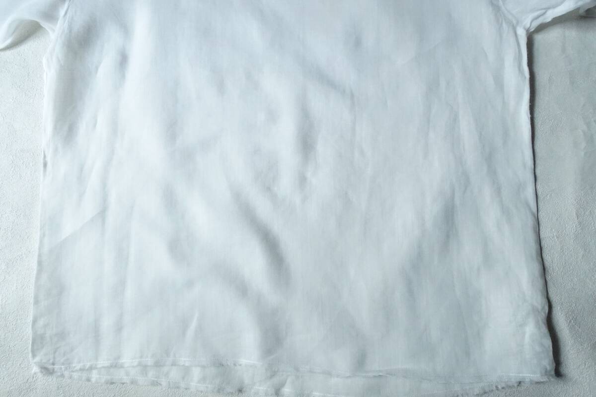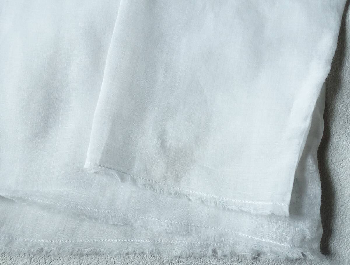 *素材* 麻100%。カジュアルすぎない程よい光沢とハリ感がポイントの、珍しい高番手のラミー素材を製品染めした素材。透け感のある薄手地。
