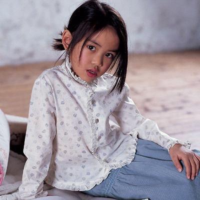 白地小花プリント。襟、前立て、裾、袖口とフリル仕上げになっています。