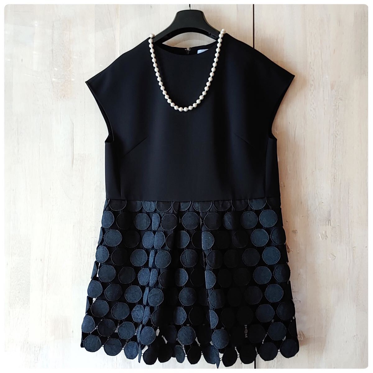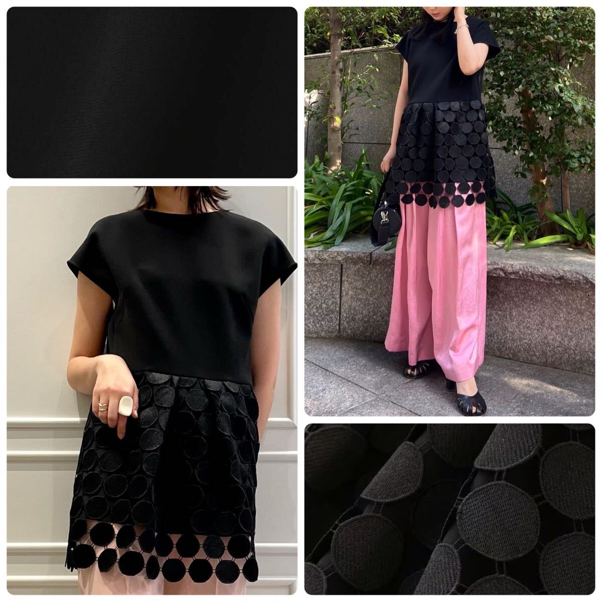 通常のケミカルエンブロイダリーレースよりもモチーフのドットをしっかりとさせるために、張り感のある太番手のポリエステルフィラメントを、隙間なく刺繍し、モダンに仕上げた素材。