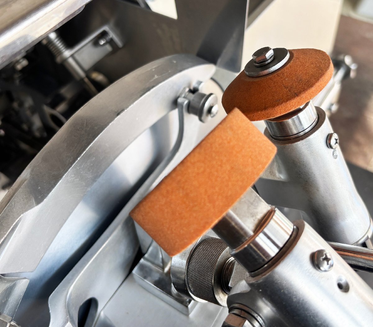動作確認 | 通電および刃の回転と上部機構のスライド・各部調整ハンドルの確認です。 |