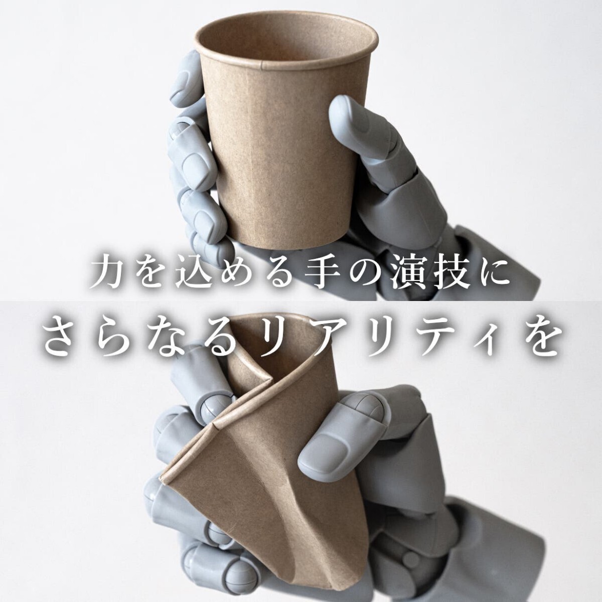 新たに設計された、手のひらのポケットに指先を潜り込ませることで、プラスチック素材では難しかった柔らかな筋肉の変形に極めて近い表現が可能に。