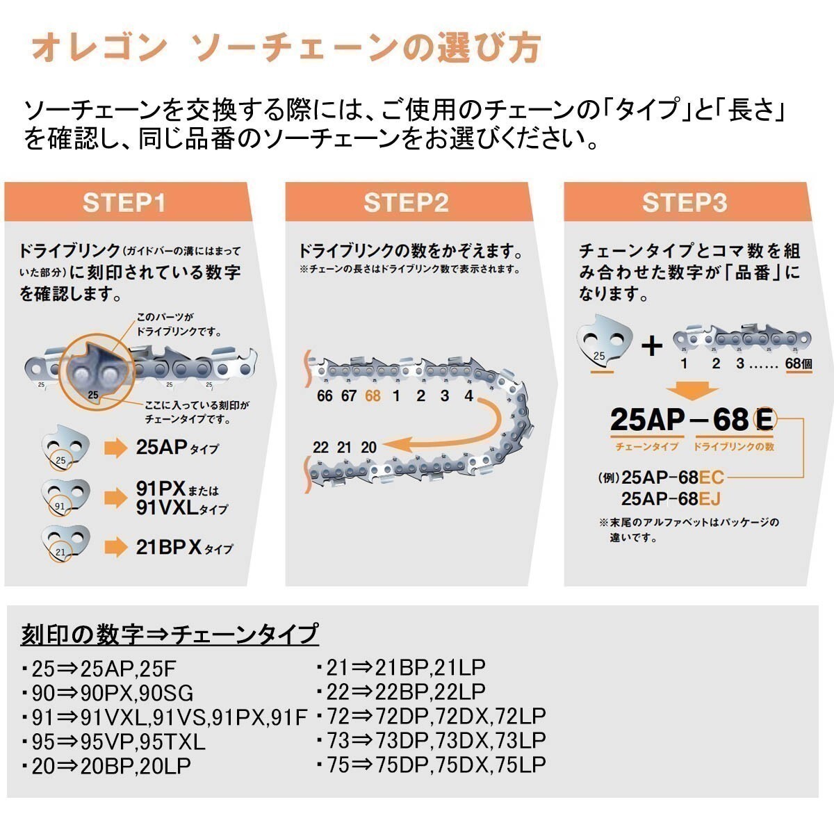 商品説明 | 領収書の発行を承ります。 落札後、取引メッセージにてお申し付けください。 メーカー:スチール チェンタイプ:61PMM3(ピコマイクロミニ3) ※オレゴン対応チェン:90PX ドライブリンク数:50 ピッチ:3/8"P ゲージ:.043"(1.1mm) ■ 注意事項 ■ 掲載写真にある『ソーチェーンの見分け方』を参考にご使用中のチェーンと一致するかご確認ください。 無理に使用したことにより、ガイドバーやソーチェン、チェンソーが破損しましても責任を負いかねます。 在庫状況により、掲載写真にあるスチールの外箱が付属しないことがあります。 予めご了承くださいませ。 ■ ソーチェン特長 ■ エントリーレベルの使用に適した低振動チェンです。 非常に狭い切り目により、鋭く高性能な切断能力にも関わらず、キックバック発生率が低く、摩耗が低く抑えられます。 STIHL はソーチェンとガイドバーも自社製造しており、高品質、耐久性、完璧なカッティングを保証します。 リンク内の穴はチェンの摩耗を減らすよう精密加工されています。 カッターは耐摩耗性の硬質クロムメッキを施していますので、目立ての回数を減らすことができます。 チェンオイルを節約するスチールEマチックシステムやスチールオイロマチック潤滑システムによって、スチールチェンソーを経済的に使用することができます。 チェンソーの性能を最大限に発揮させるため、ご使用になっているチェンソーに合ったソーチェンをお選びいただくことは非常に重要です。 |