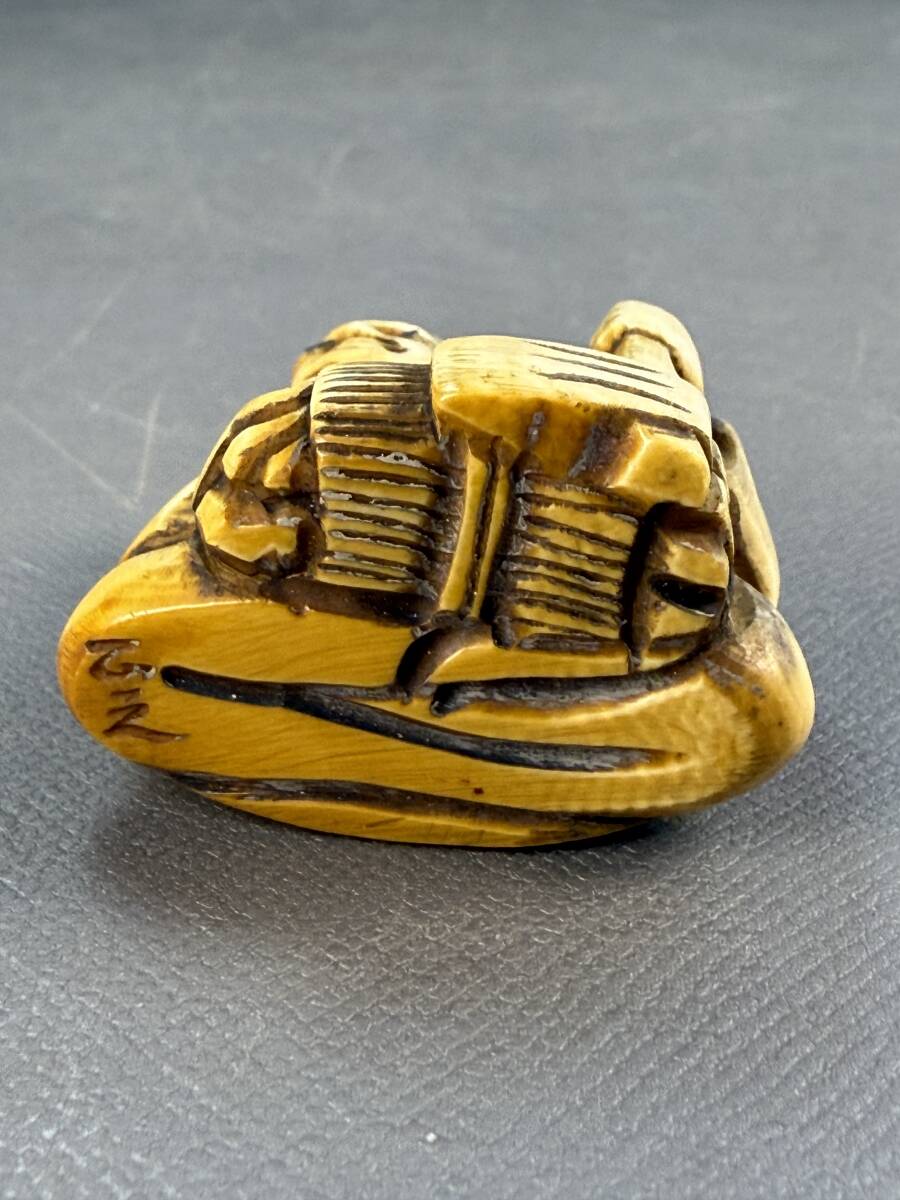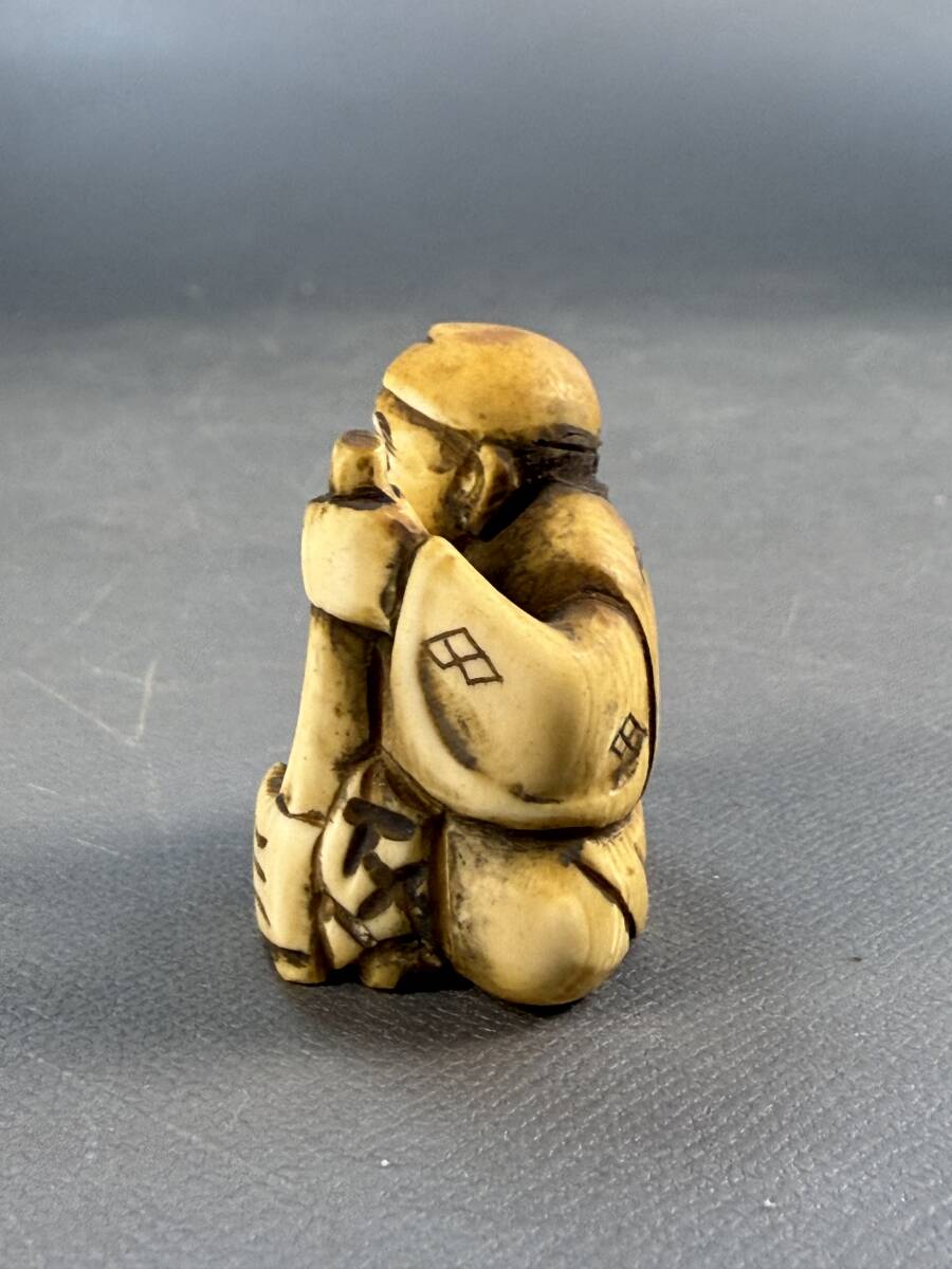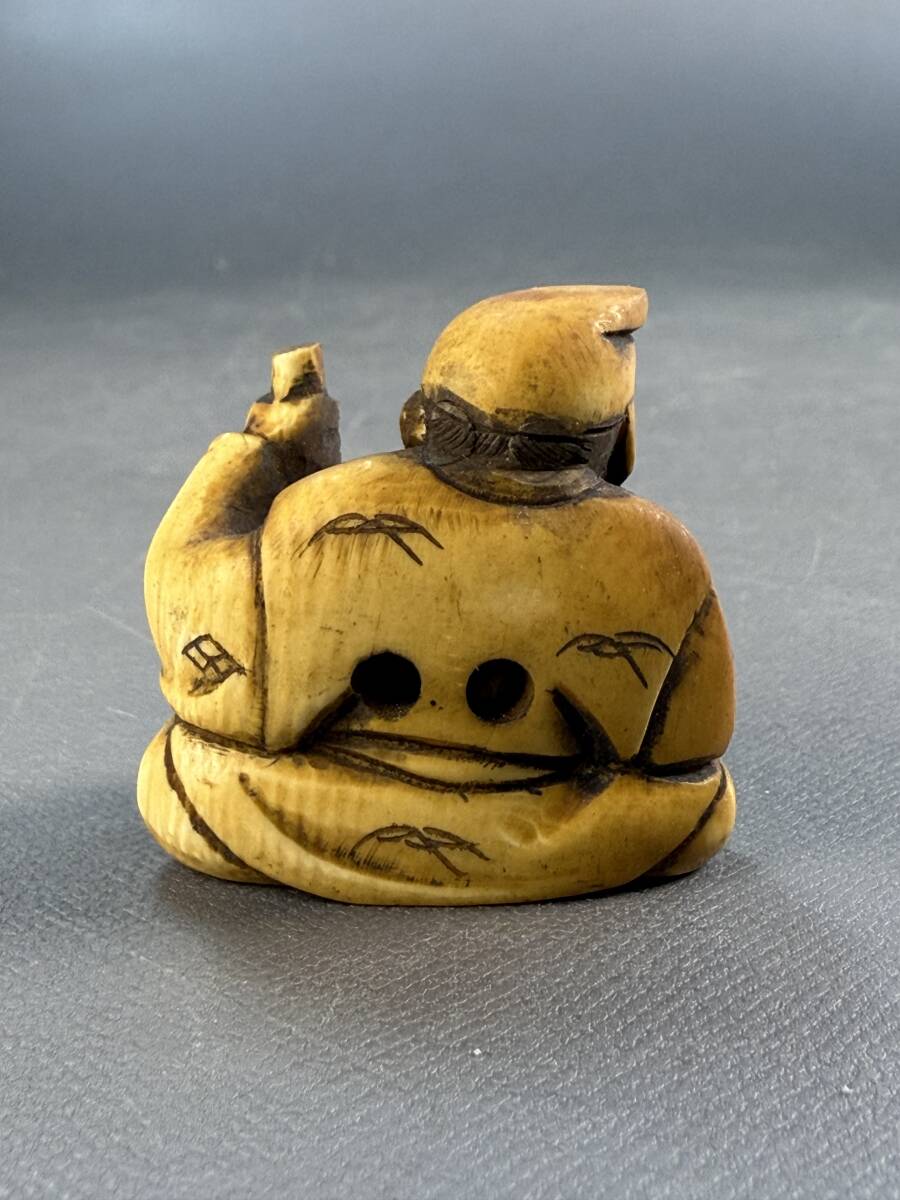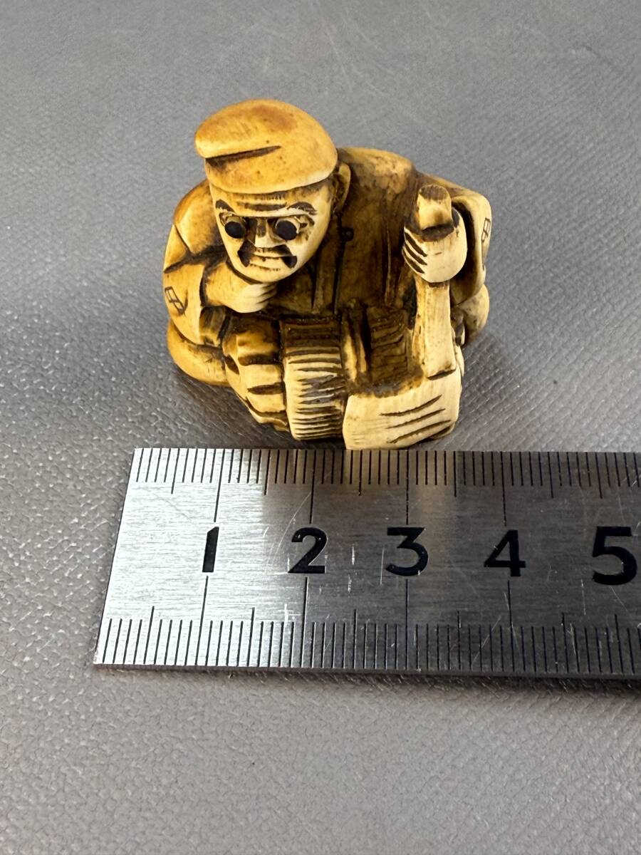 【偲】鯨歯風 天然白材 根付 人 細密彫根付 作家物 提物 彫刻 美品細密彫 」江戸時代 在銘 重約23.90g r-658