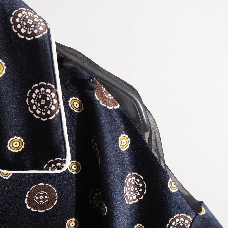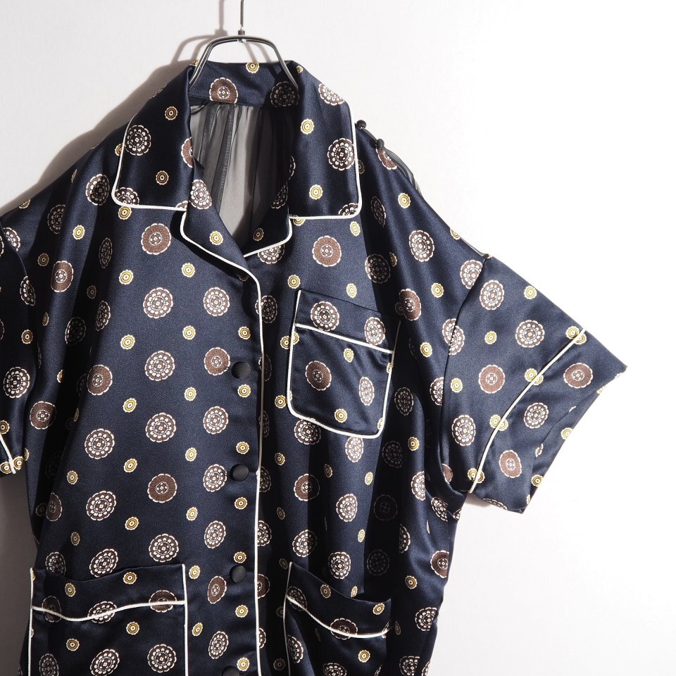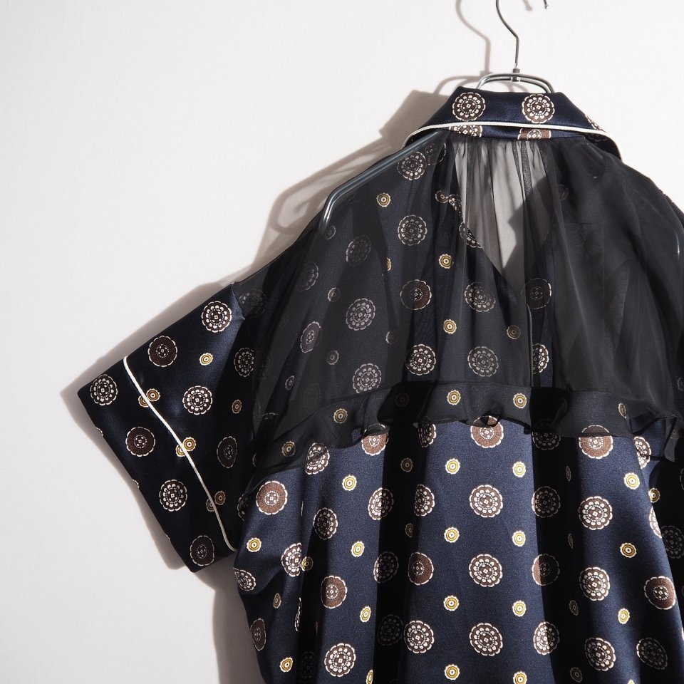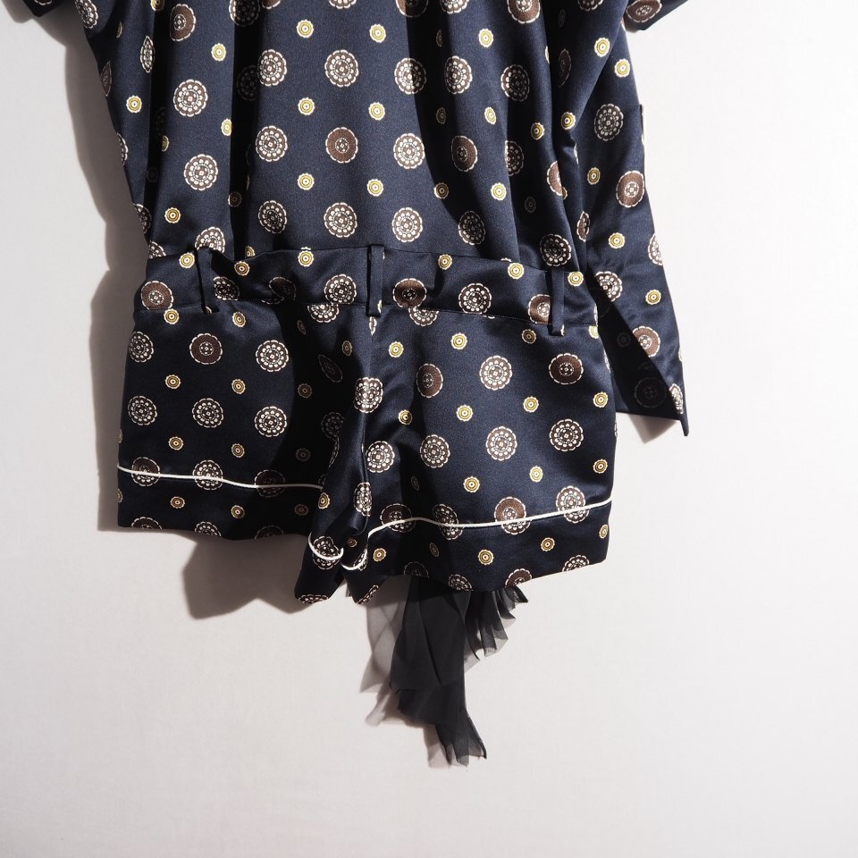 21SS Komon Print バックシアー サテン 半袖 シャツ ショートパンツ ドッキング オールインワン ネイビー