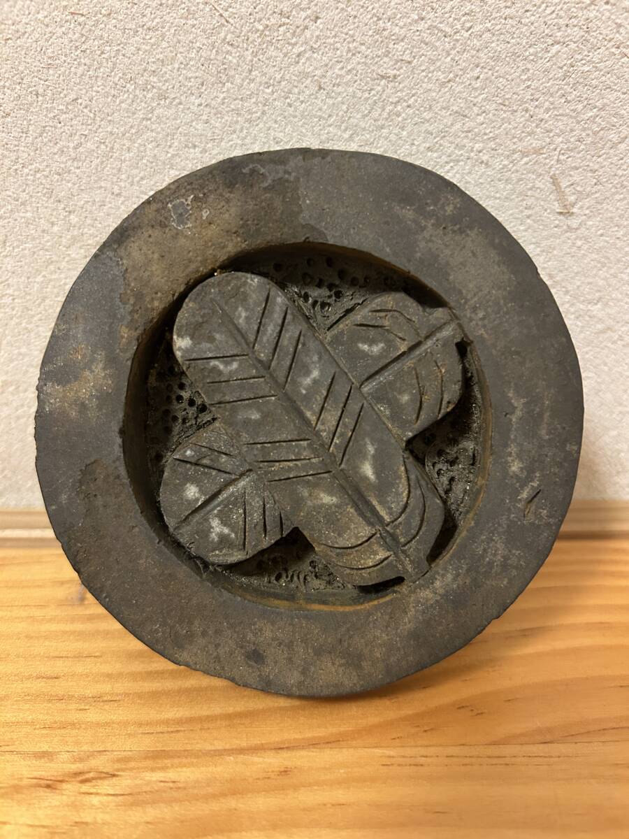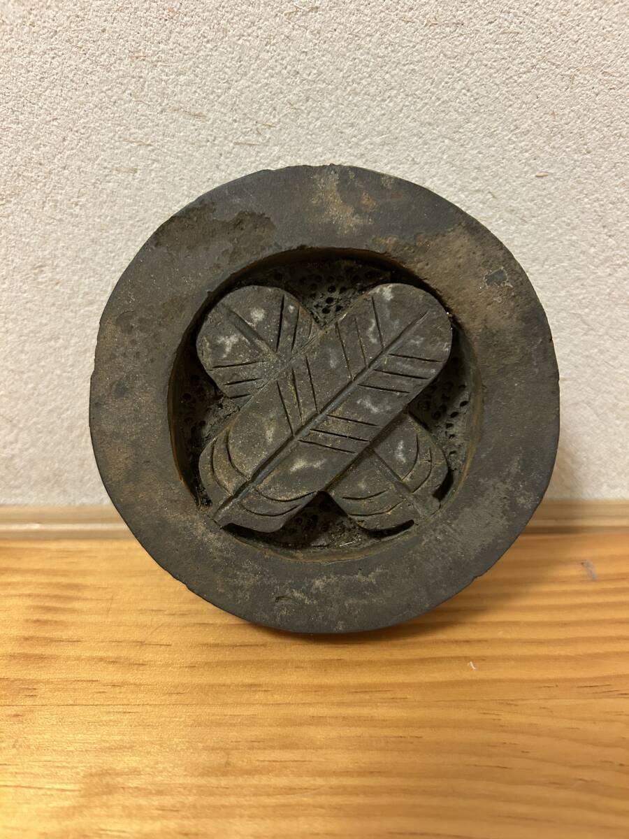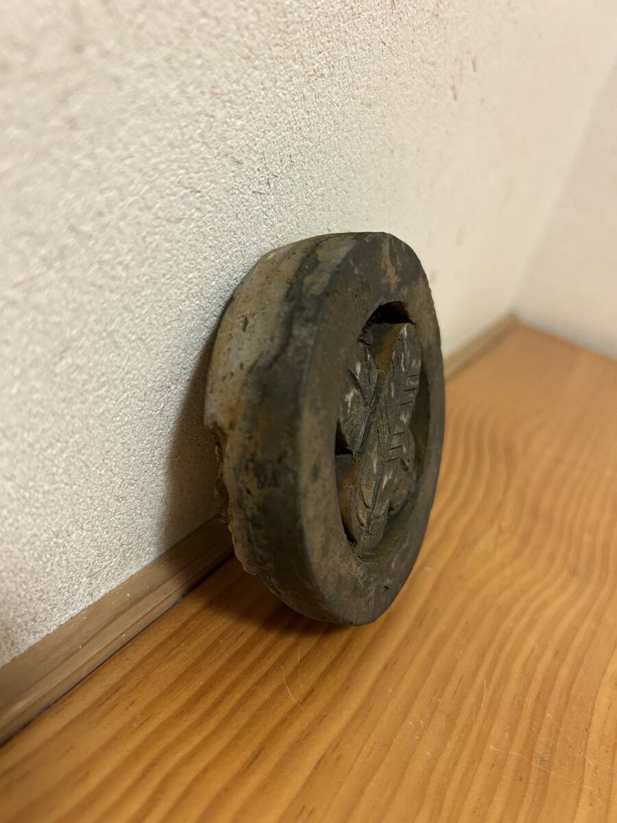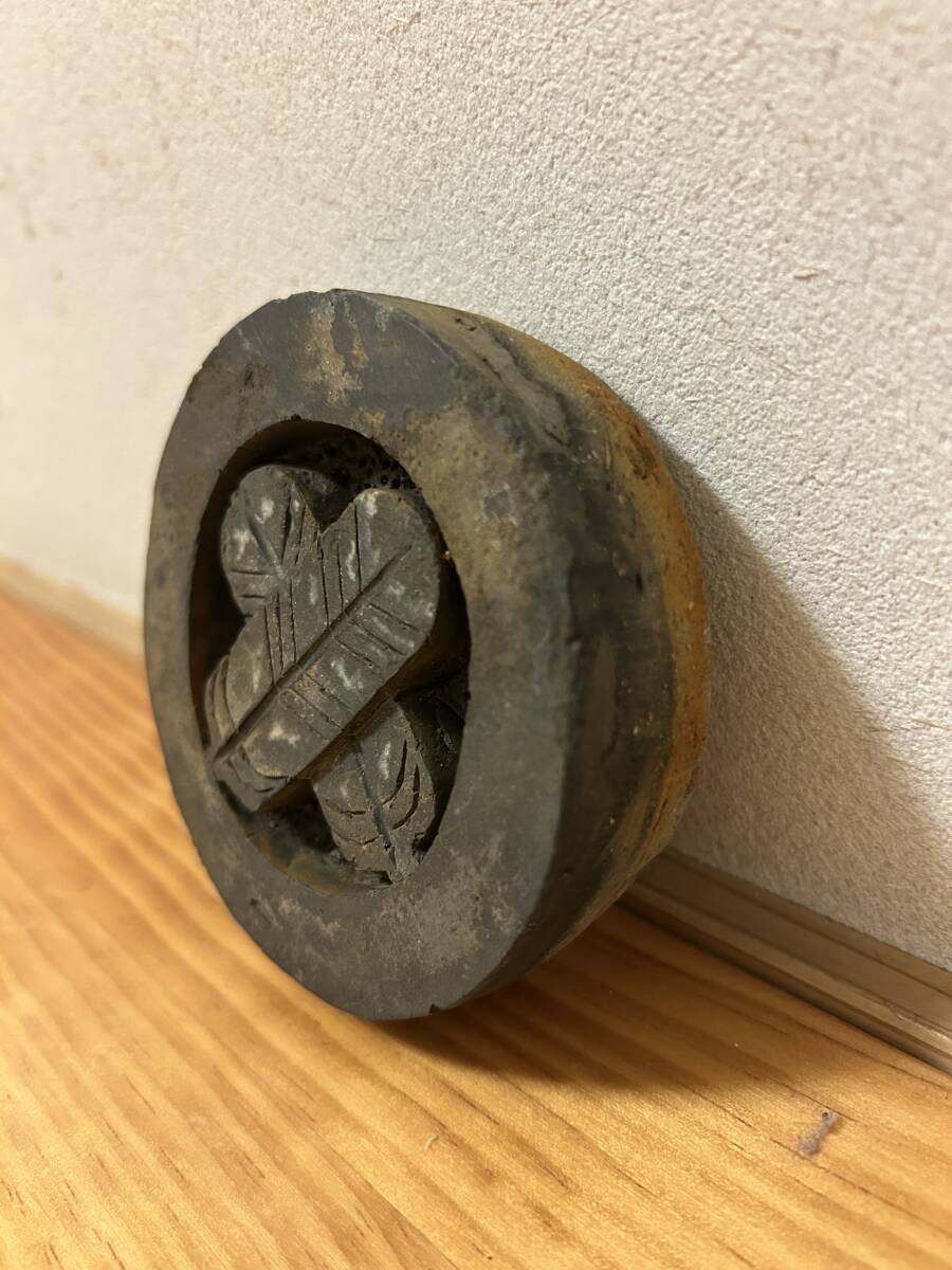 大変珍しい、古瓦 家紋瓦 丸に違い鷹の羽紋 まるにちがいたかのはもん 骨董品 古美術品 中古品 です。 戦国武将の浅野氏・阿蘇氏・甲斐氏の家紋です。 貴方(貴女)のコレクションアイテムに是非どうぞ。 大きさは直径9cm厚み2.5cm重さ292g位で、若干のダメージはありますが状態は概ね良好です。