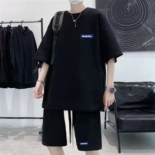 夏 カジュアル 半袖シャツ ショートパンツ 韓國ファッション セットアップ 上下セット メンズ ブラック 2XL