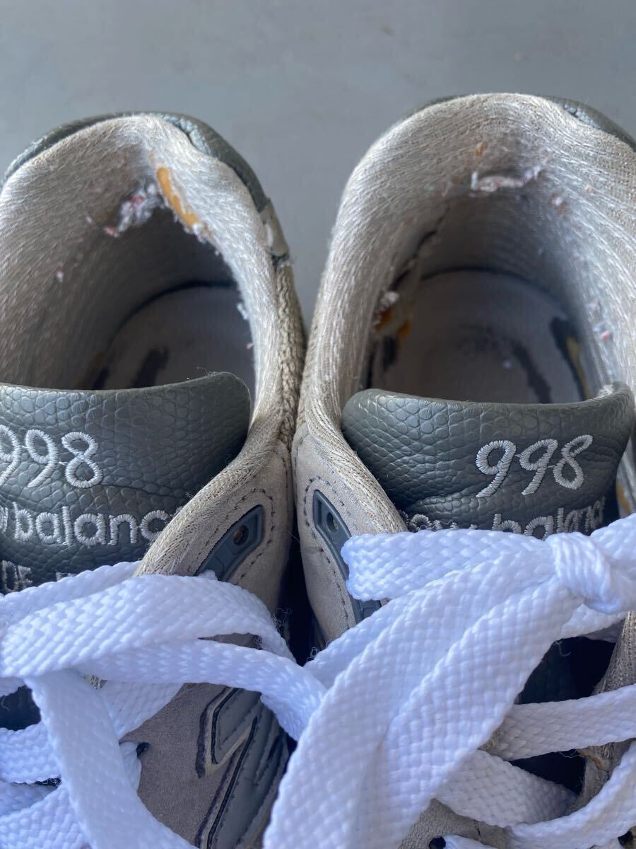 ヒールカウンターの破れ、インソールの擦り切れが有ります。全体的に使用感あります。シューレースは新しい998を買った際に白すぎたのでこの靴に付いていたものと交換しました。なので靴紐だけ新しいです。古着であることをご理解の上入札して下さい。