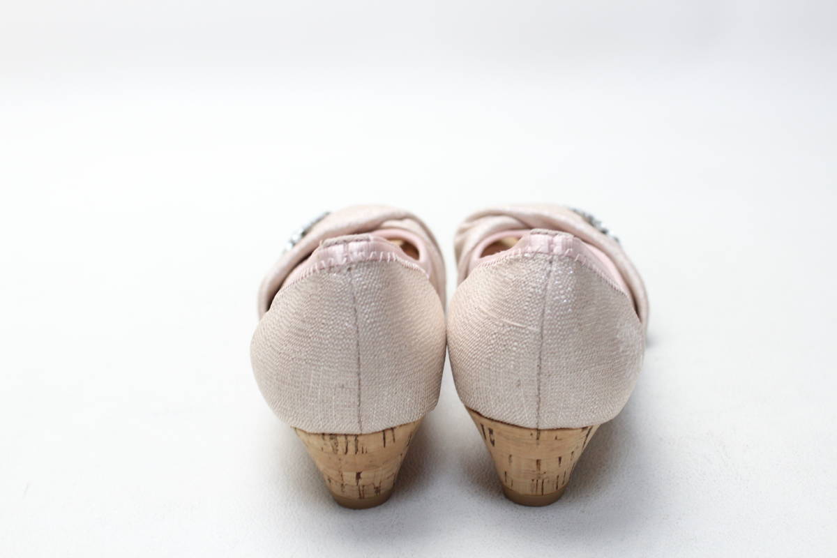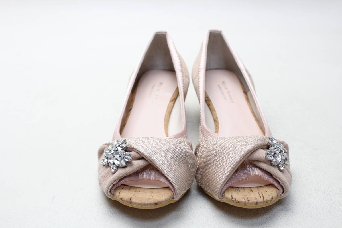 大きめのクリスタルビジューや、4cmの低めヒールが好印象が足元を演出します。
