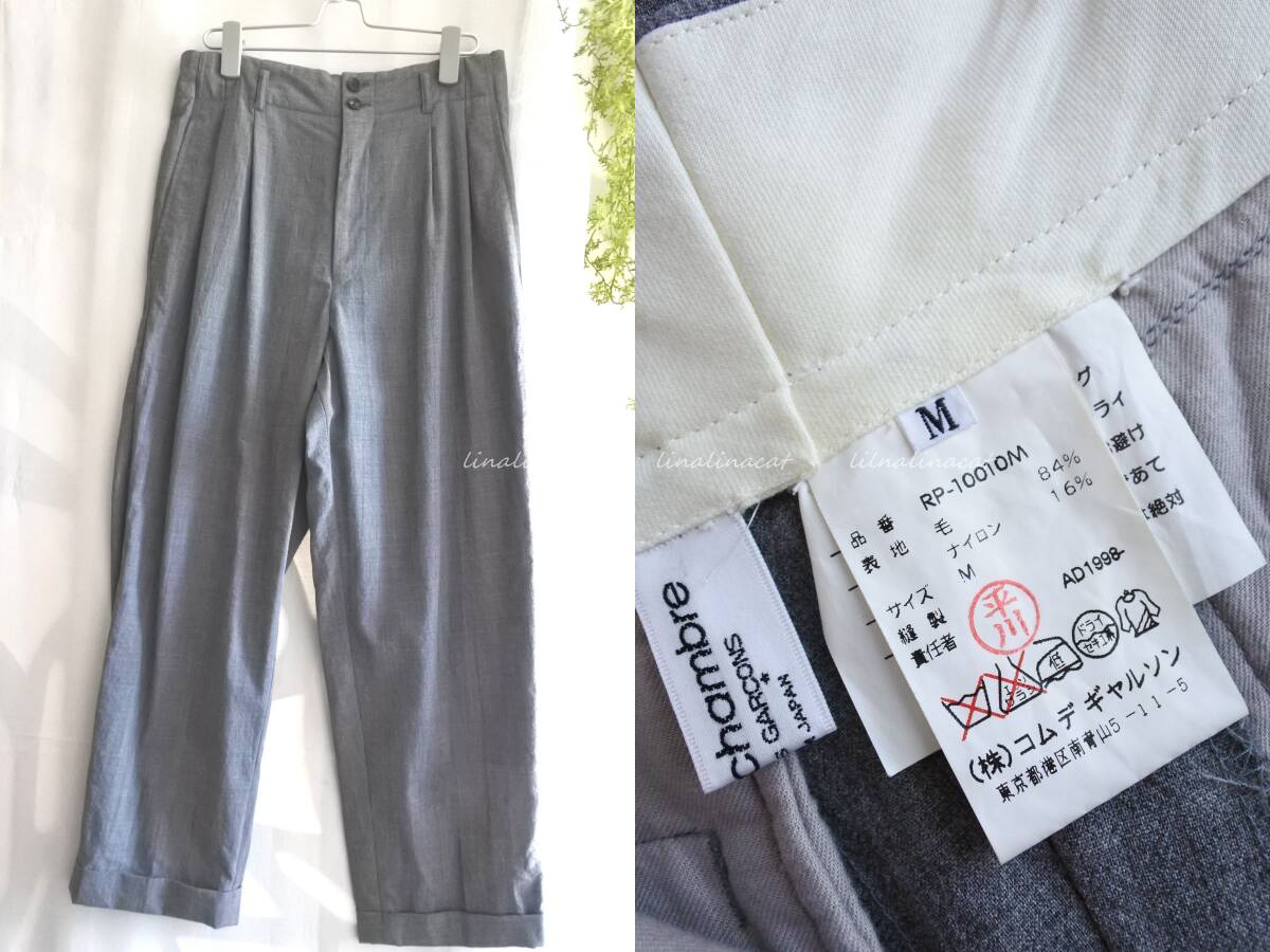 Size: М ウエスト 約37.5㎝ ヒップ 約51㎝ また上 約37㎝ また下 約62㎝ わたり 約33㎝ 裾幅 約19㎝ 総丈 約91㎝ ※平置き採寸となります Color: ライトグレー 独自の世界観でデザインを展開するコムデギャルソンの上品な梨地サマーウールを贅沢に使用したタックアンクルパンツです。 「正しく」メンズライクに仕立ててあり、本格的なお作りです。 センタープレスせずにラフにこなれた感じで2,3度ほど着用したのみの大変綺麗なお品です。 とくに目に留まるよごれやダメージなどもなく、毛羽立ちもありません。 大変綺麗なコンディションです。 ローファーや革靴、サンダルまで似合ってしまう、アンクル丈で涼やかな夏の装いを。 フロント側にのみ裏地があり歩く際も滑らかです。 陽にかざすと少し透け感がありますがほぼ透け感はありません。 これ一本できまる、シンプルでモードなパンツ ワイズ、ヨウジヤマモト、イッセイミヤケ、など お好きな方にもお勧めです。 クロゼット整理のため他にも出品中です。 おまとめ取引も大歓迎ですのでお気軽にお声がけくださいね。 | ||