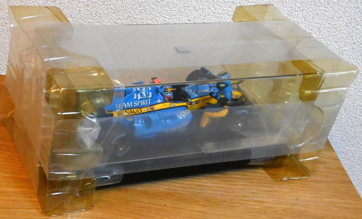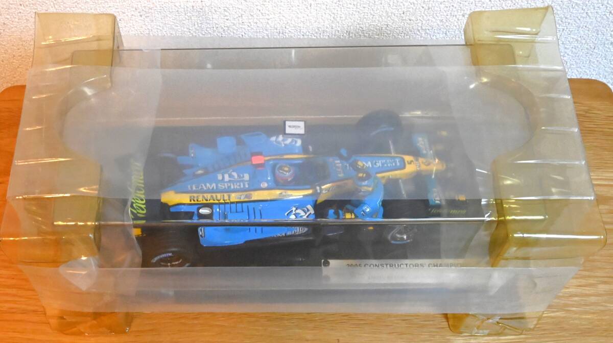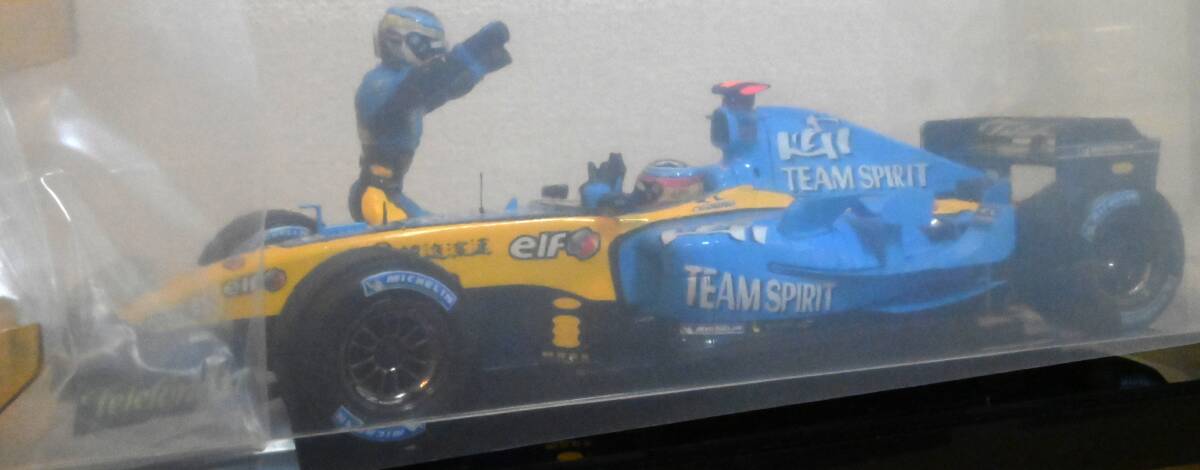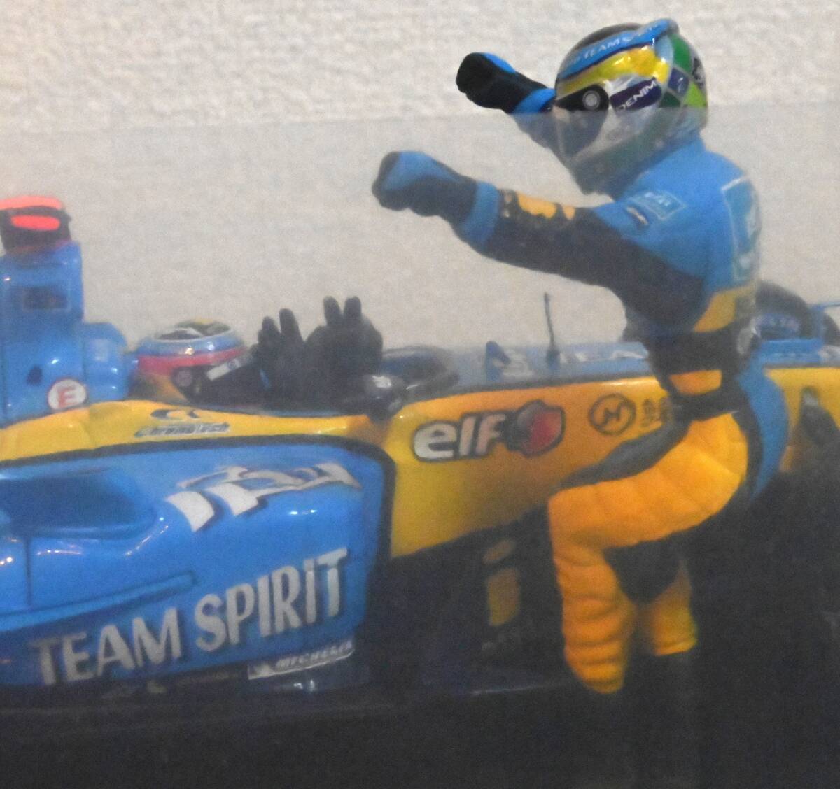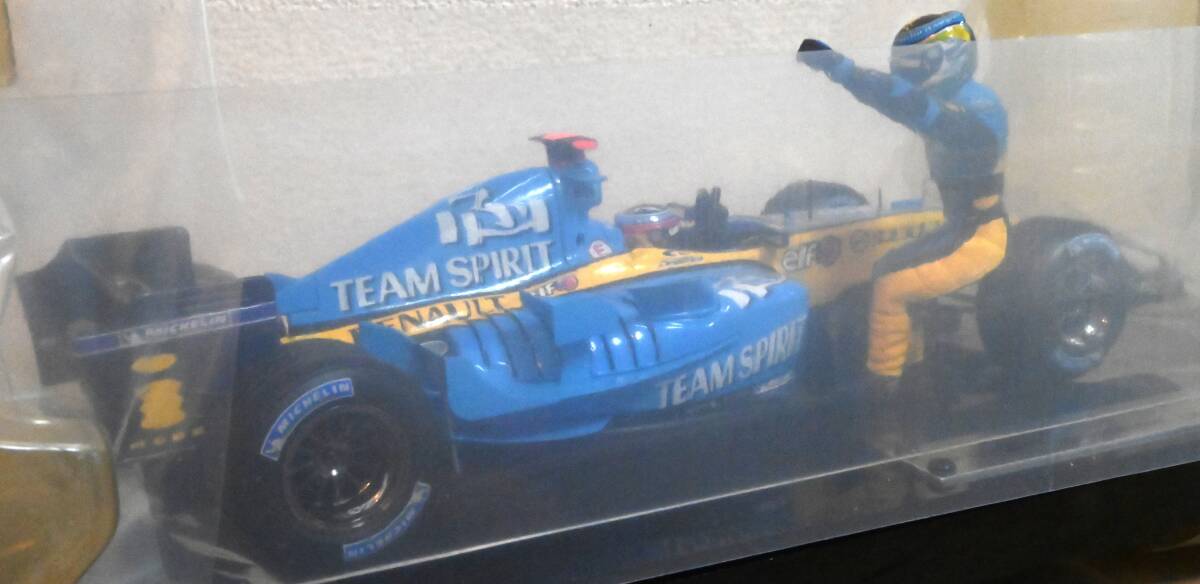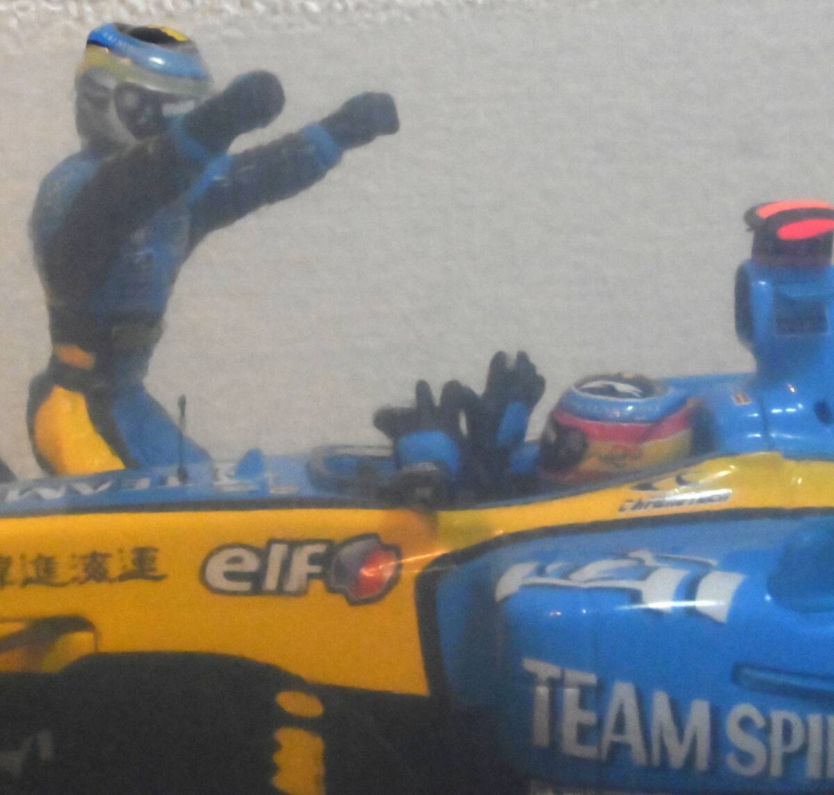 2005 中国GPでF.アロンソがダブルタイトルを獲得、F.アロンソがフィニッシュラインを通過後にG.フィジケラがかけよった場面がジオラマになっておりメーカー純正専用透明ケースと台座が附属します。