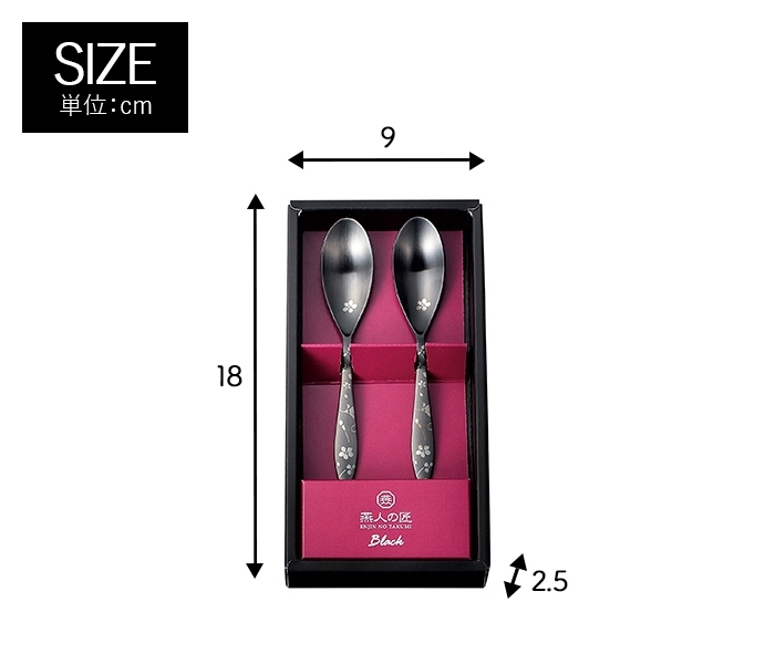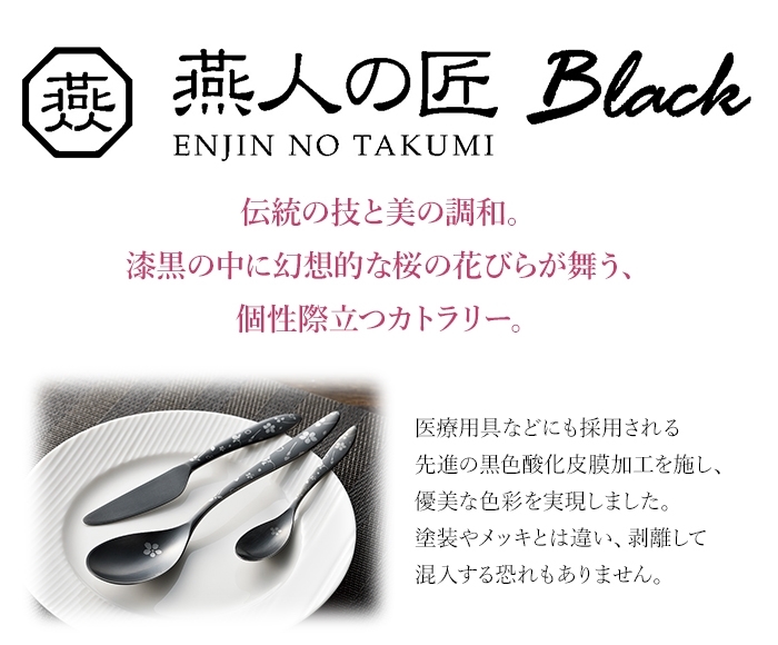 ◇伝統の技と美の調和。 ◇漆黒の中に幻想的な桜の花びらが舞う、個性際立つカトラリー。 ◇医療用具などにも採用される先進の黒色酸化発色加工を施し、優美な色彩を表現しました。 ◇塗装やメッキとは違い、剥離して混入する恐れもありません。 |