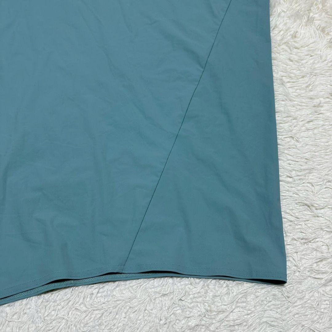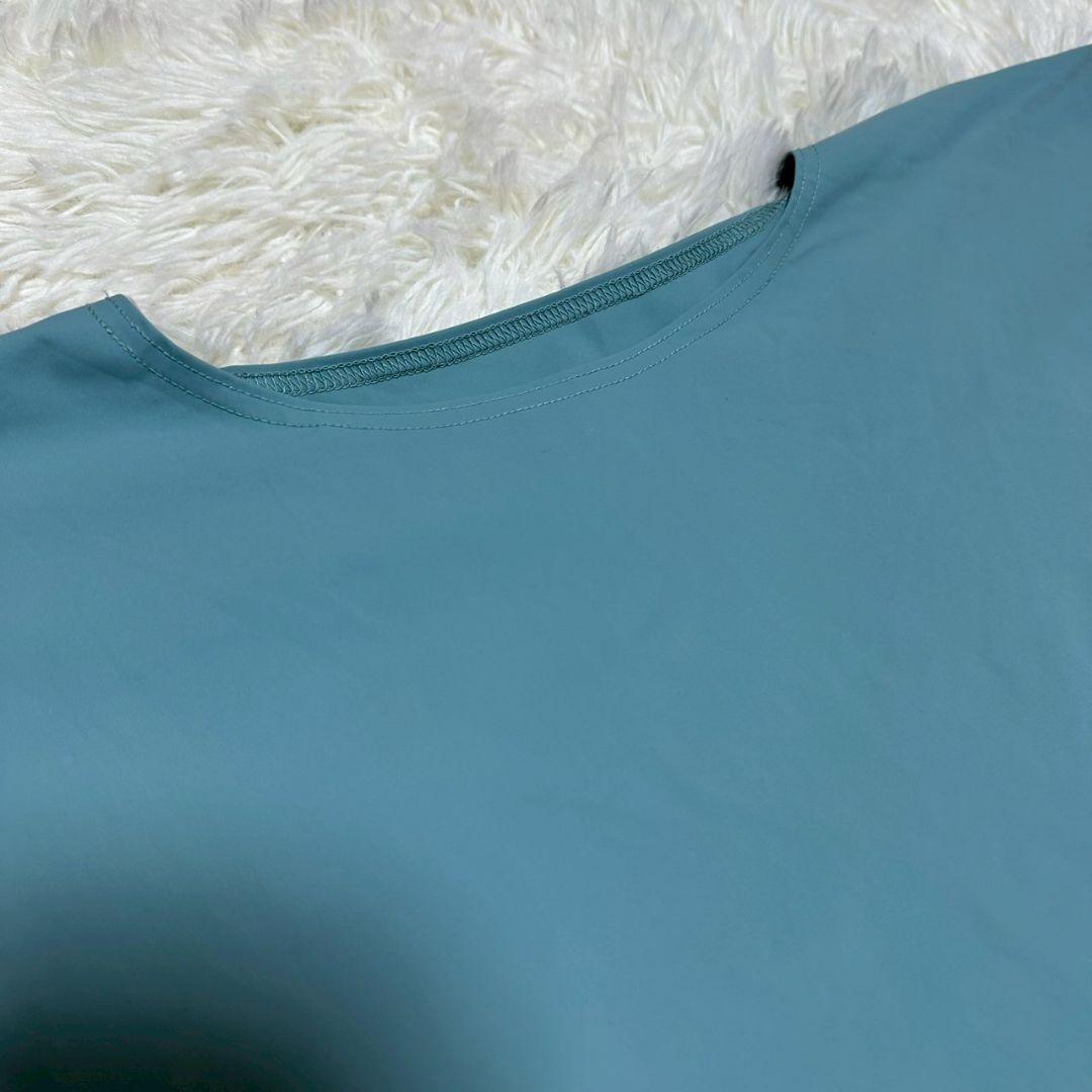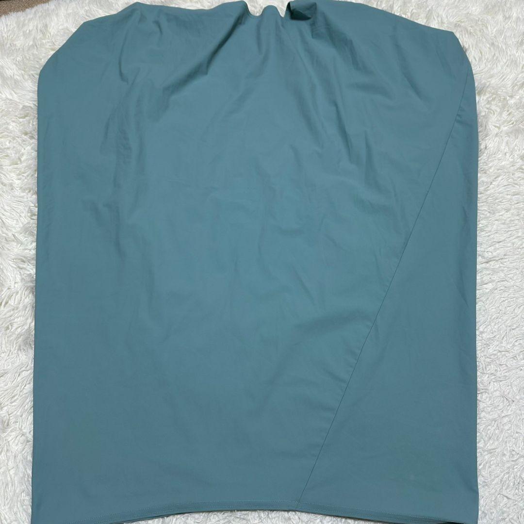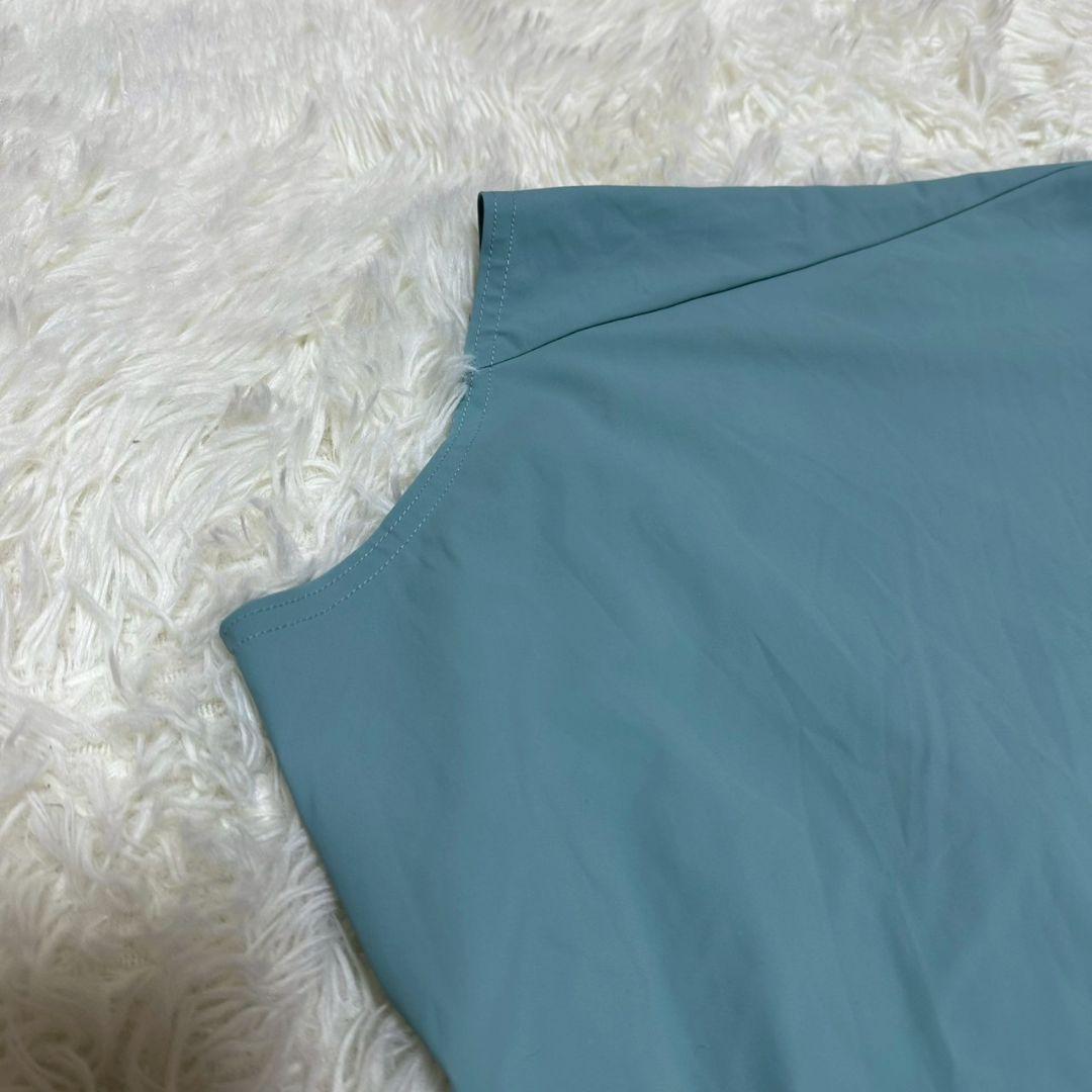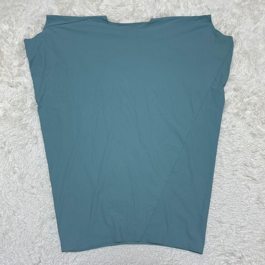 アシンメトリックカットのノースリーブチュニック、柔らかい青緑色の生地。