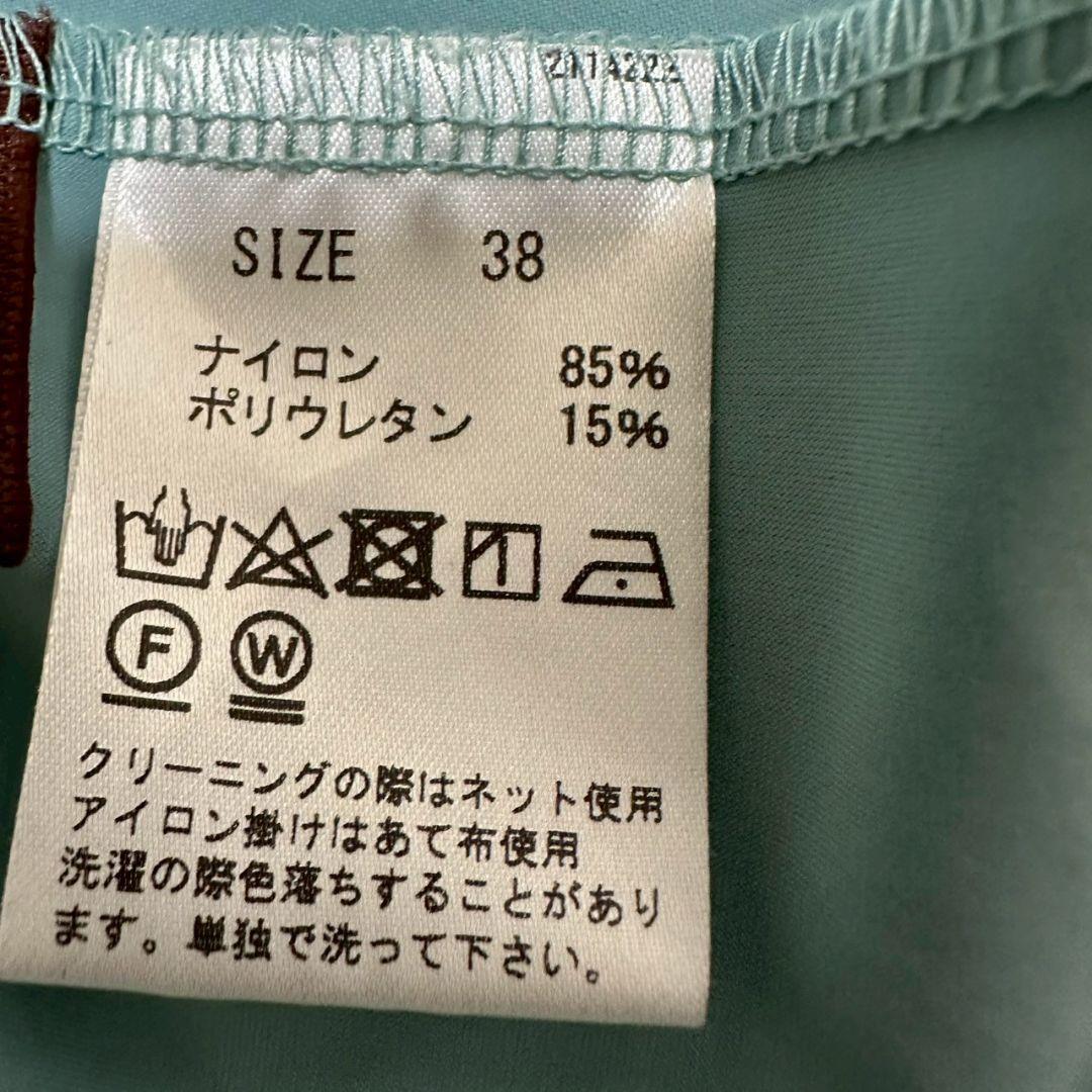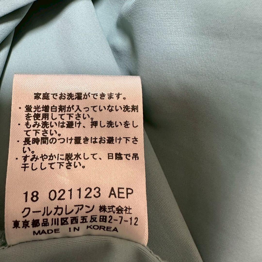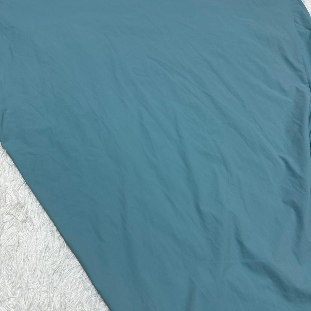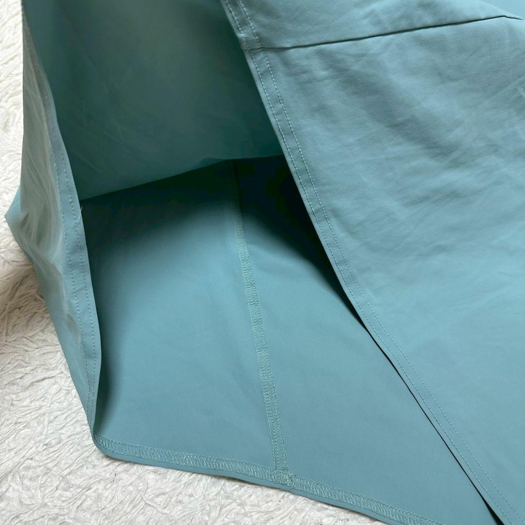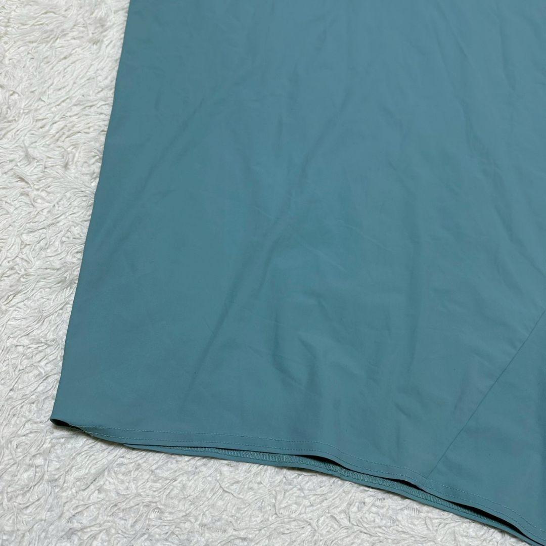 アシンメトリックカットのノースリーブチュニック、柔らかい青緑色の生地。