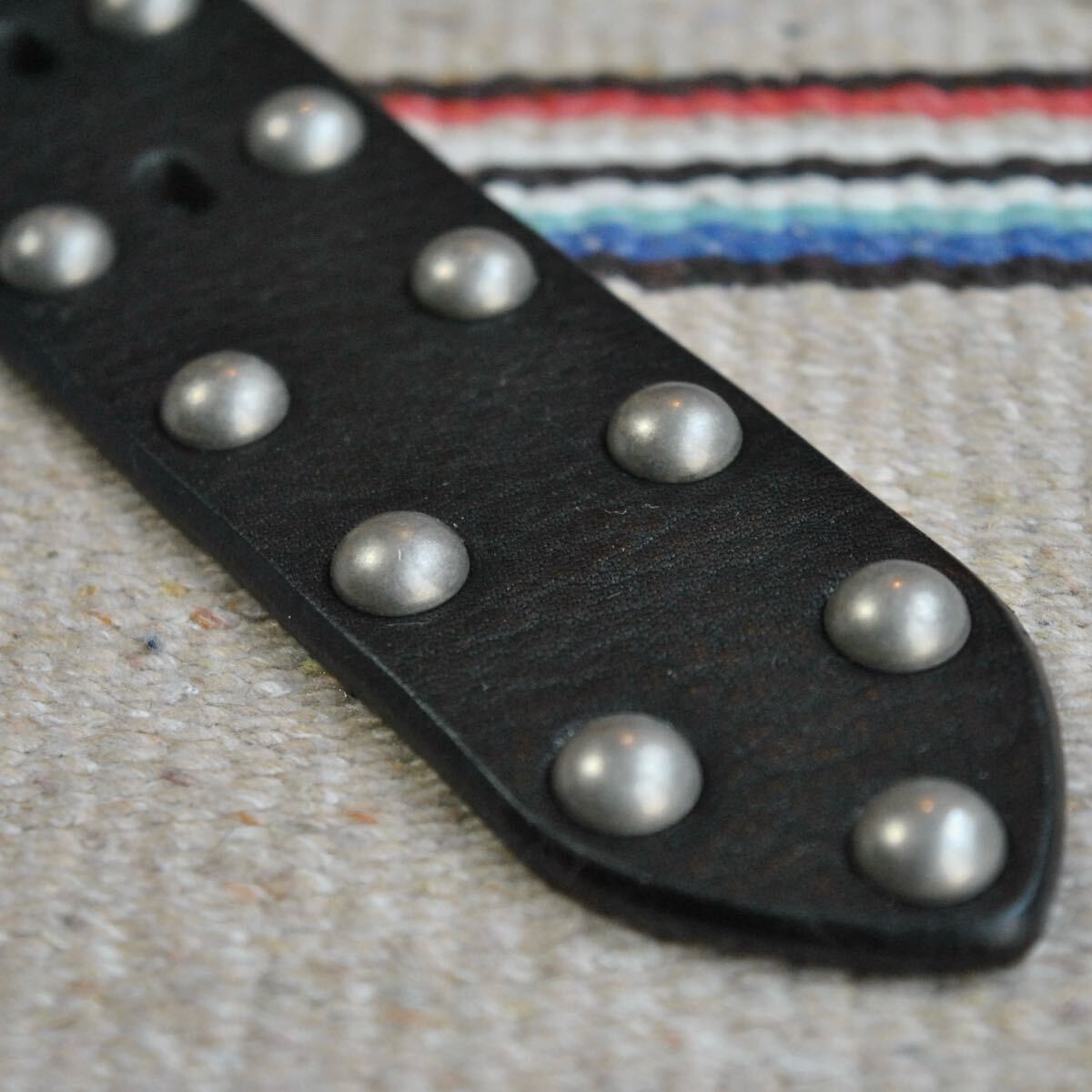 バックルは、ひとつひとつ手縫いで留められ、ハードな雰囲気の中に温かみのある風合いも。