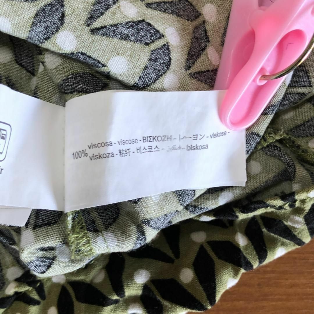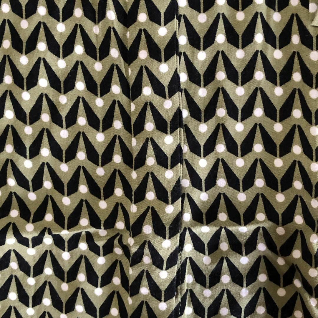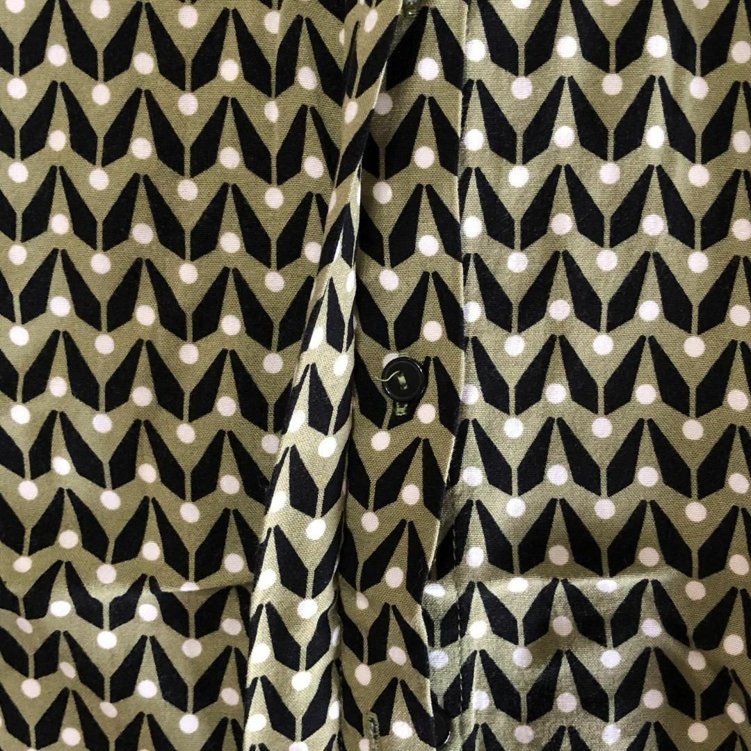 グリーンとブラックを基調としたユニークな総柄で、レトロな雰囲気も感じられます。さらりとした軽やかな素材感で、着心地も快適です。