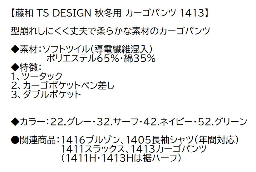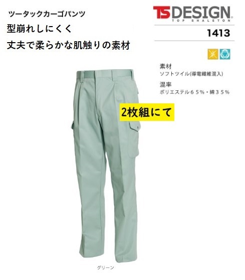 ビックイナバ特価◆TSDESIGN 1413[秋冬]カーゴパンツ【52グリーン・W105cm】ソフトツイル素材・定価1枚8250円の品、2枚即決2980円