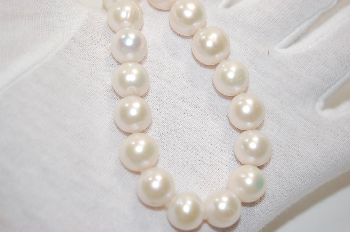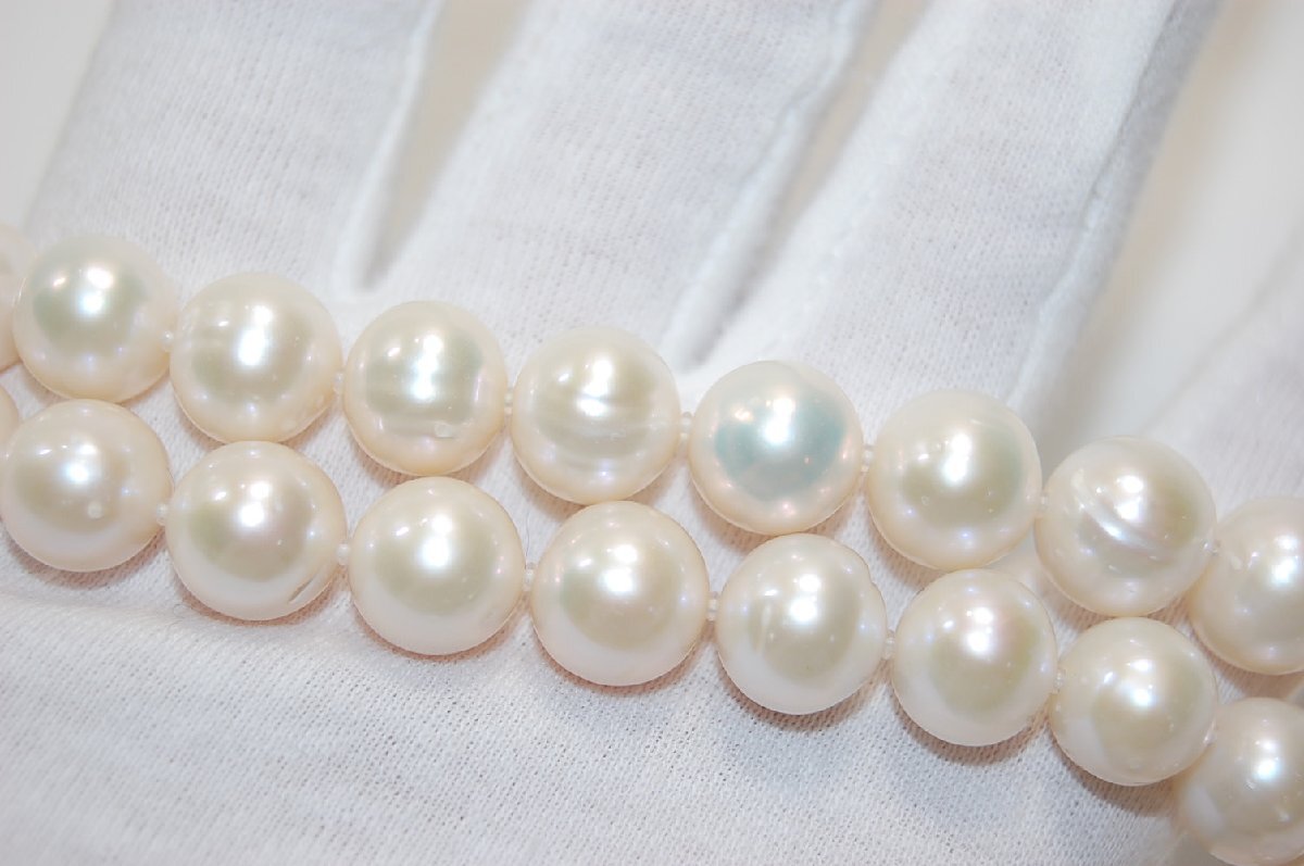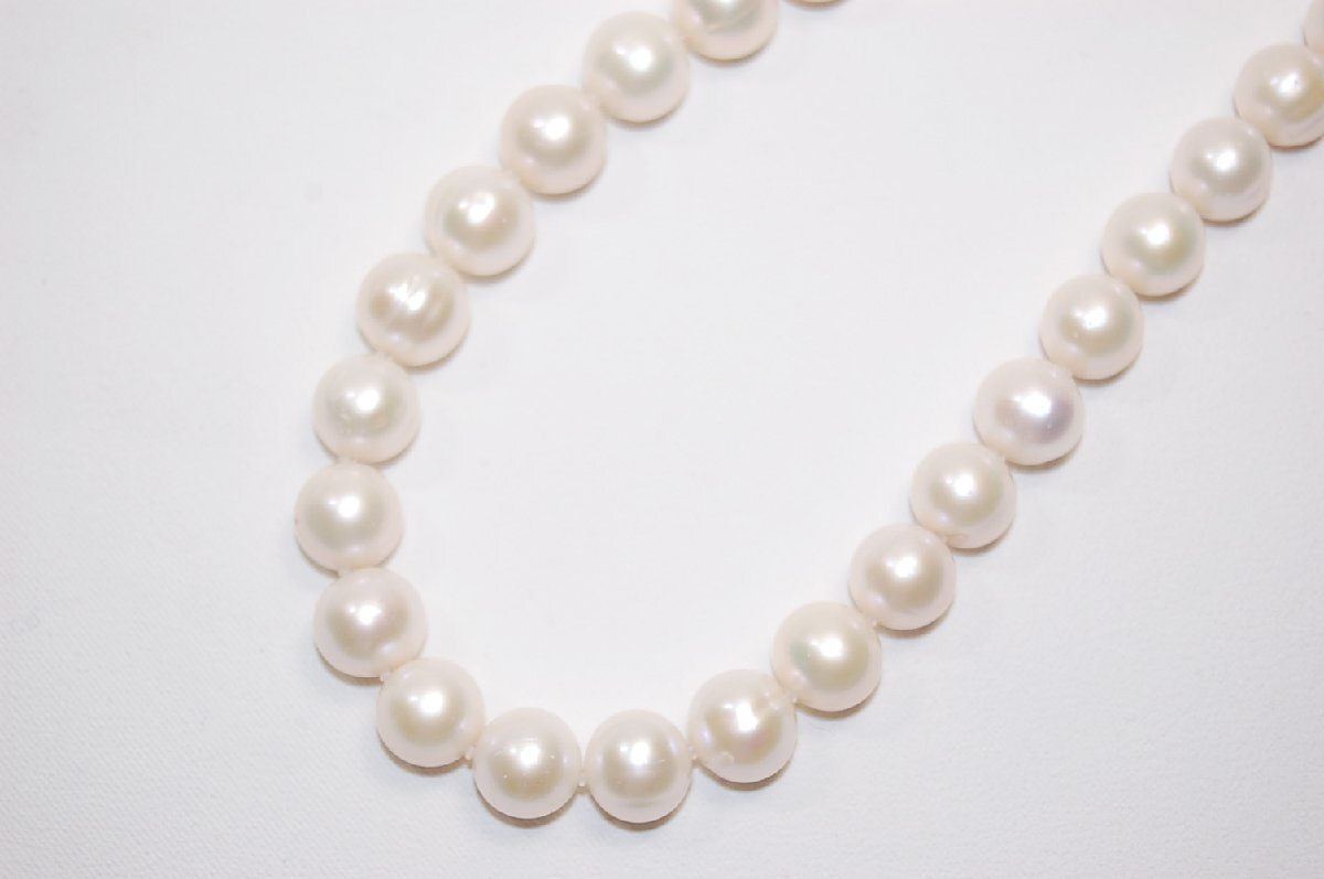 【商品名】大粒パール 淡水真珠 淡水パール ネックレス セミラウンド 【素材】シルバー金具x淡水真珠 【サイズ】直径約9.7mm~11.3mm。全長約48cm 【色】ホワイト系 【商品ランク】中古AB 【付属品】無し 【備考】パール表面に少々の小傷と天然特有のえくぼあり。重量78.2g。