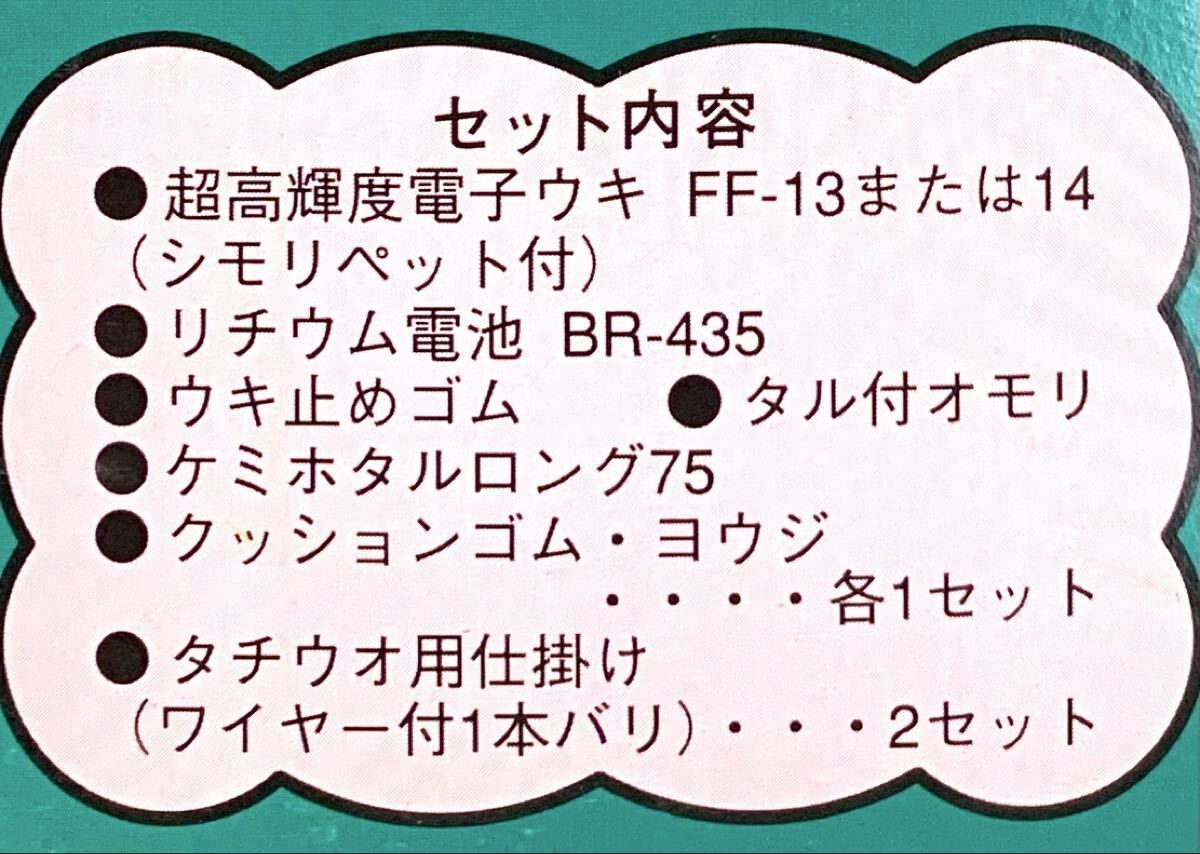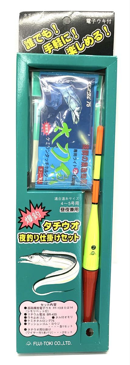 超高輝度電子ウキ2号×1、リチウム電池BR-435×1、ウキ止めゴム、タル付きオモリ、ケミホタルロング75×1、クッションゴム、ヨウジ、タチウオ用仕掛け針(ワイヤー付1本針)×2