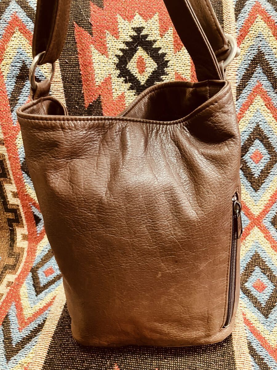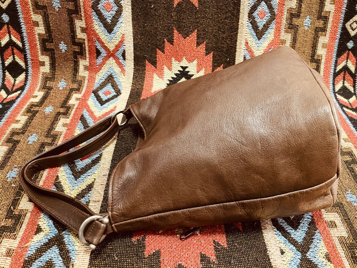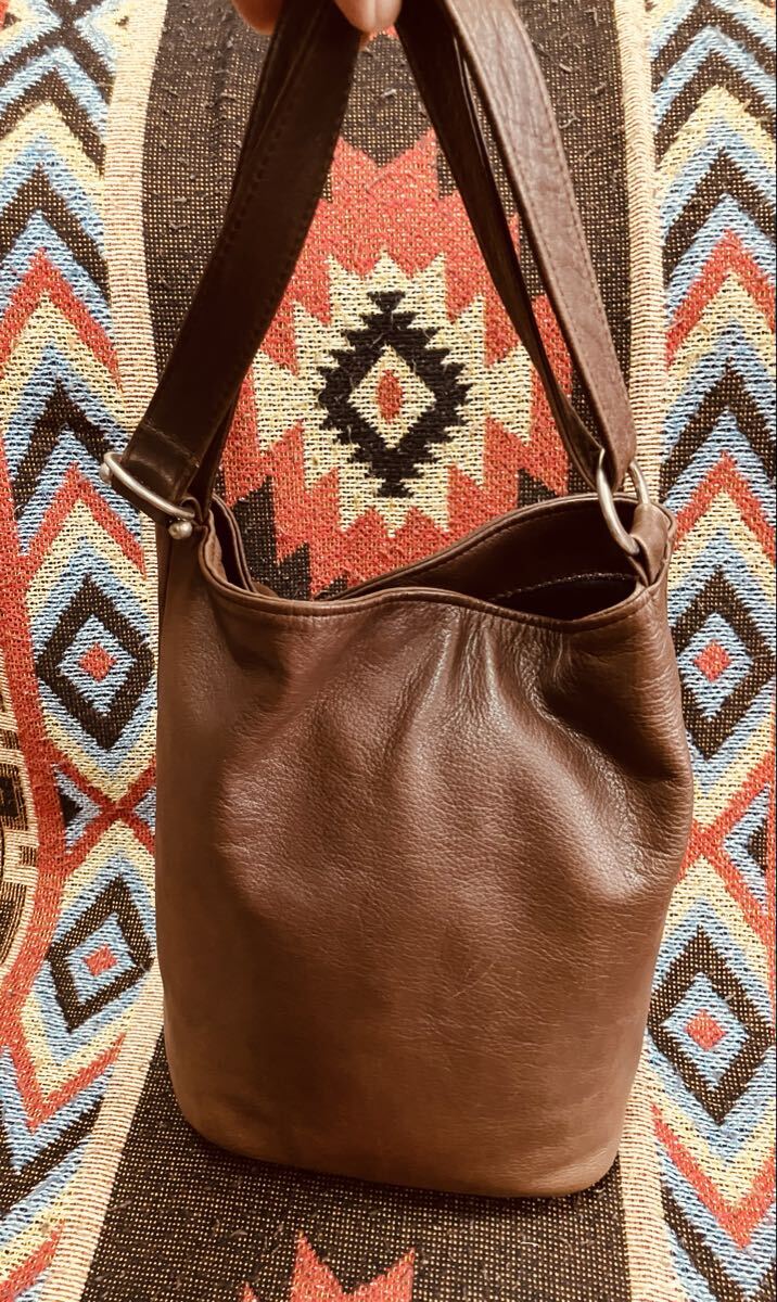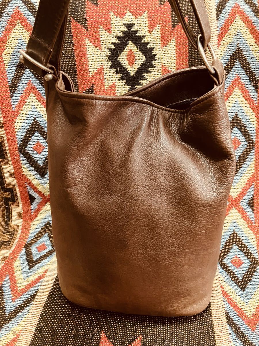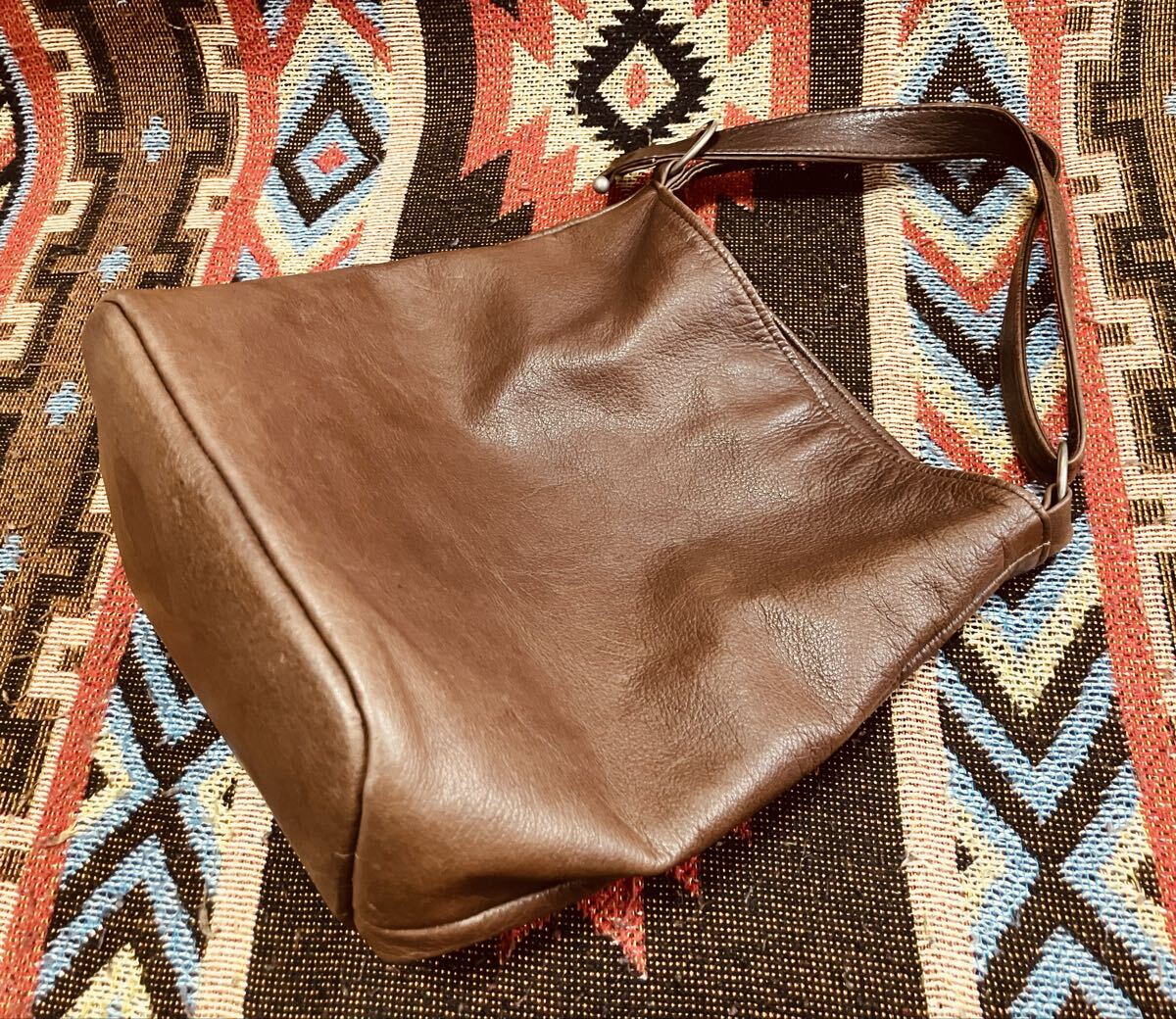 ノーブランドの、グローブレザー製バケツ型肩掛けショルダーバッグです。色はブラウンで、肉厚のグローブレザー。