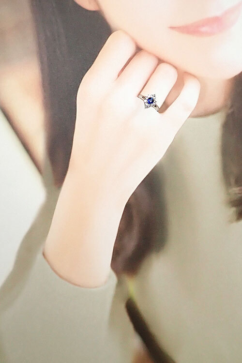 コメントタサキの、鮮やかなブルーサファイアをメレダイヤモンドでひし形状に取り囲んだ、クラシカルで上品なリングです。