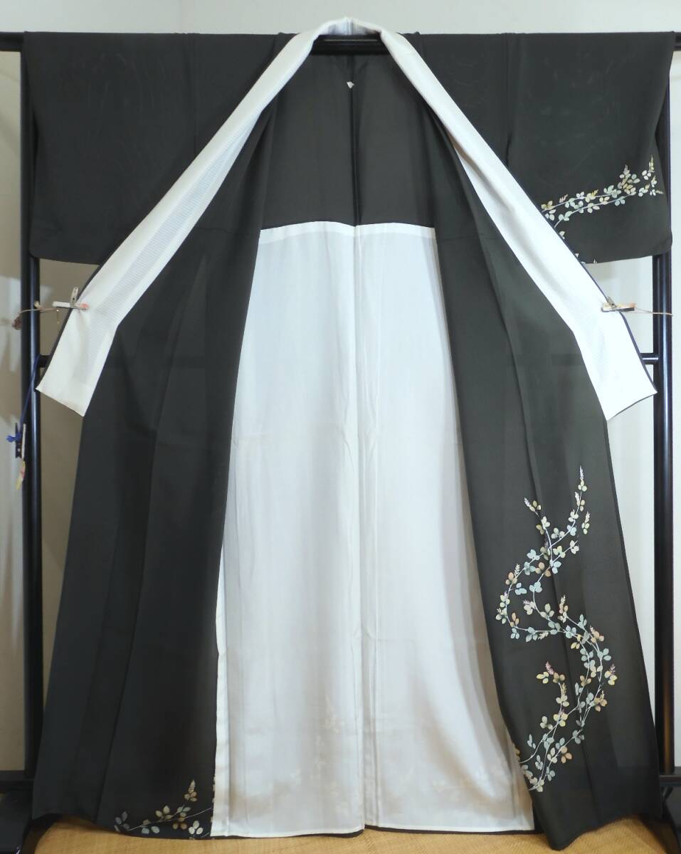 <銀の斧>正絹・絽地 京友禅訪問着着物・お茶花?萩?・和名 軍勝鼠色