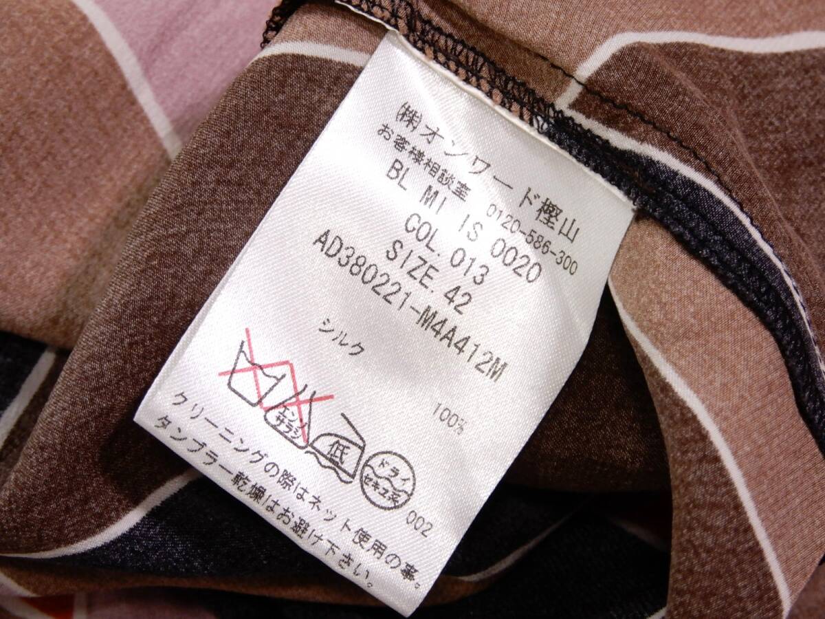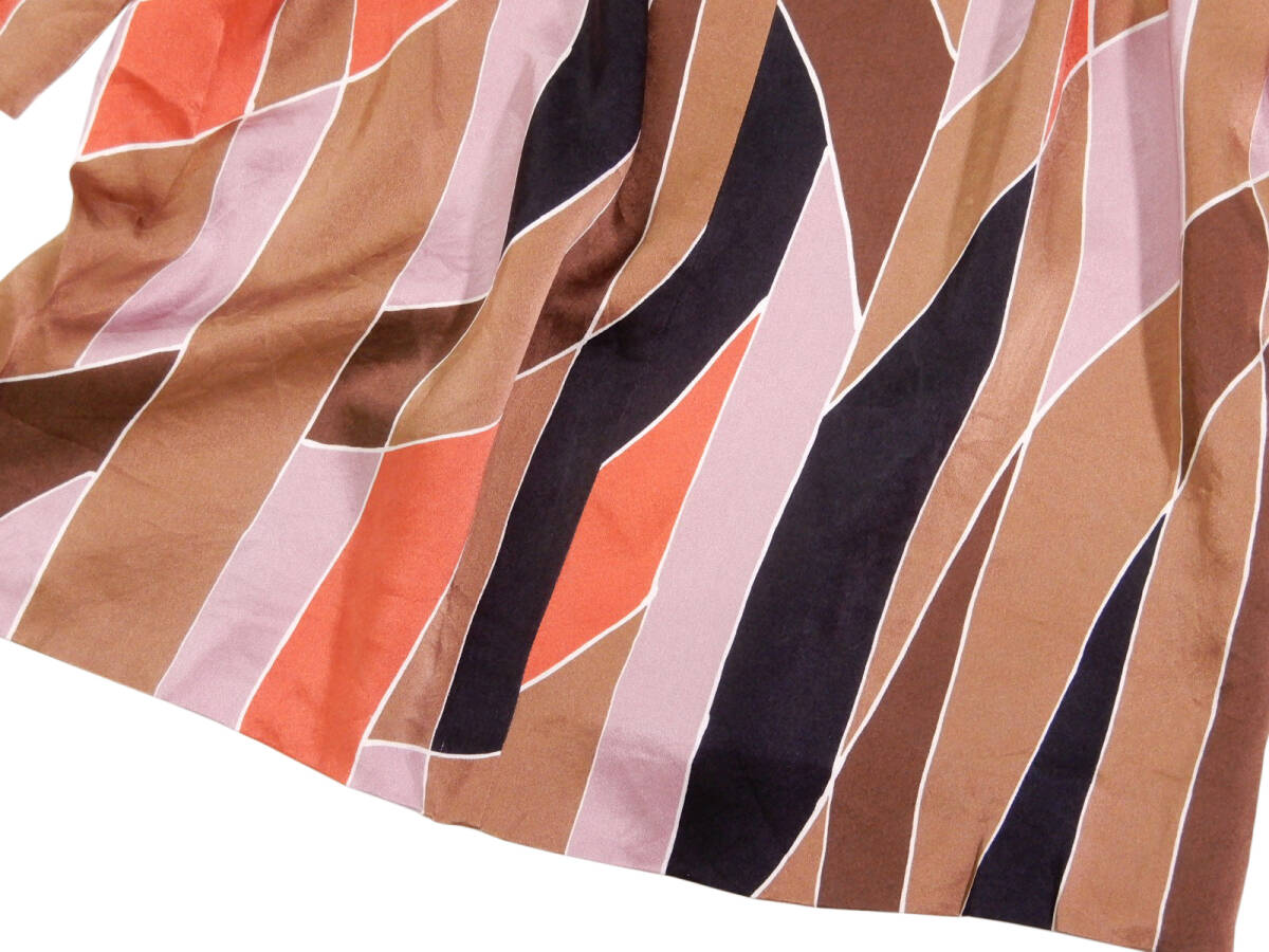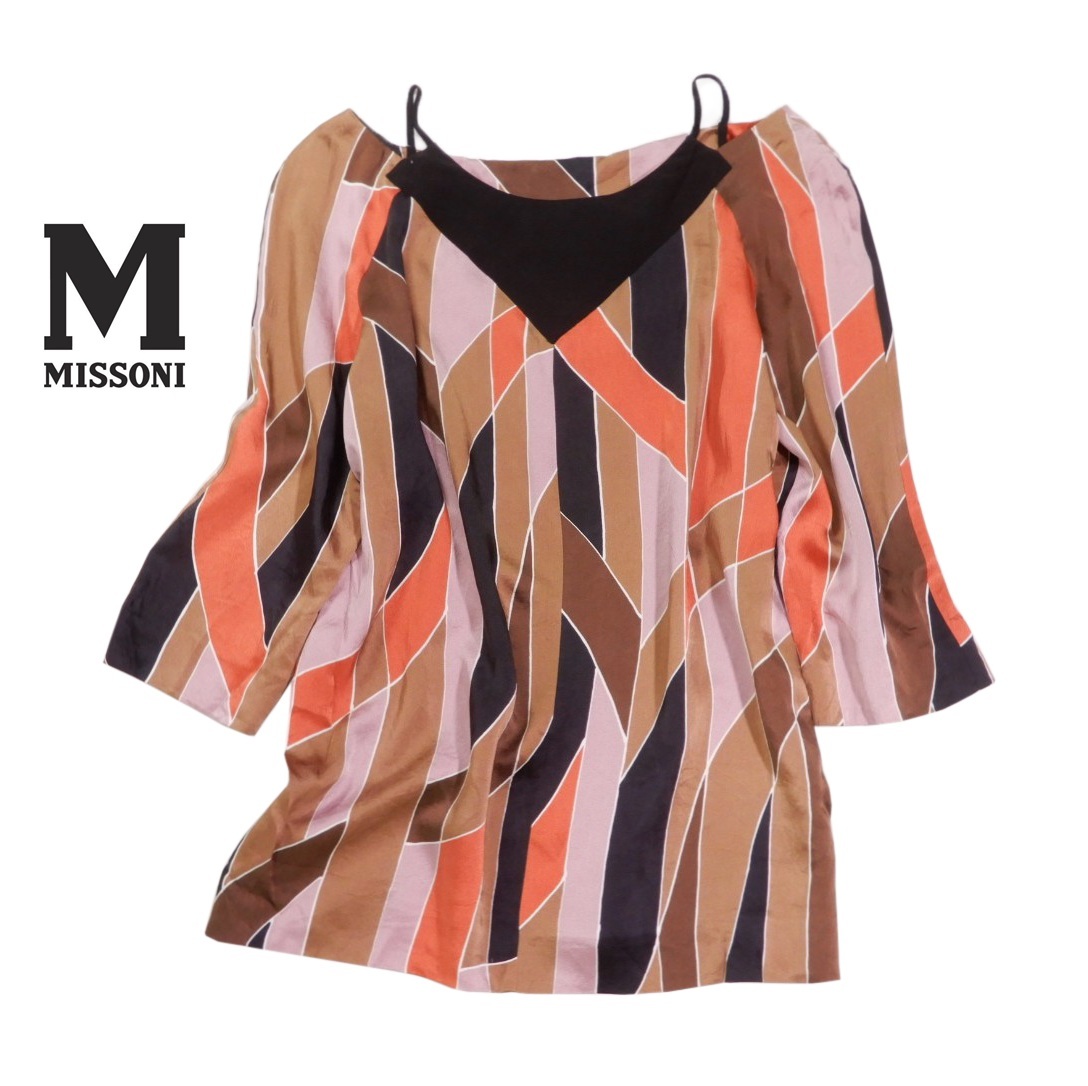 ミッソーニ ブラウス サイズ:42 お色:ブラウン系、オレンジ系、モーブ系、黒、白等 素材:シルク100% 平置き実寸:身幅47 着丈59 裄丈60㎝位 |