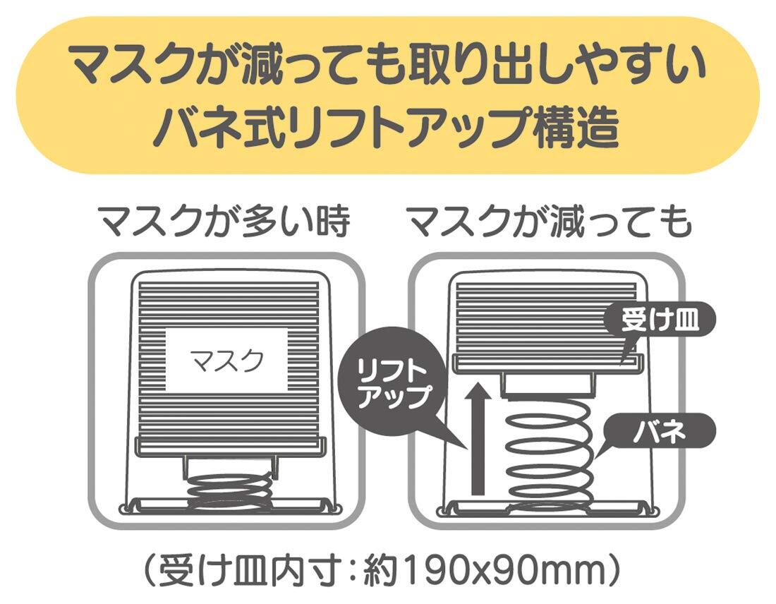説明 普通サイズのマスクが約60枚収納できる マスクケース フタ部分の手前を押すだけでサッとフタが開くワンプッシュオープン式 マスクが減ってもバネによりマスクが上がってくるので取り出しやすい、リフトアップ構造 見た目ではマスクケースには見えないところがGOODポイント 【使用方法】 マスクの入れ方 (1) 底板を外します。 (2) 本体にマスクを収納します。 (3) 受け皿と底板をセットします。