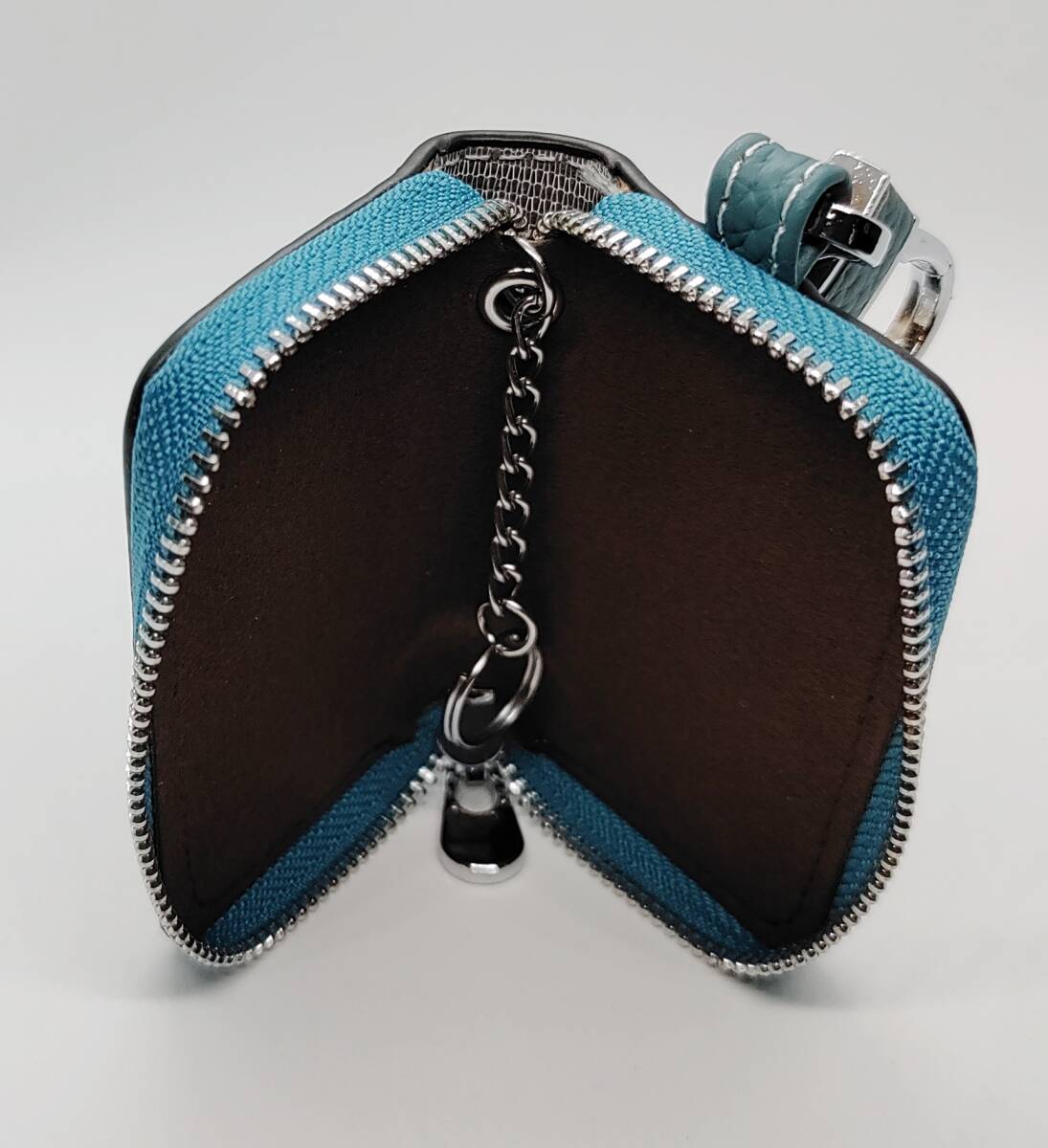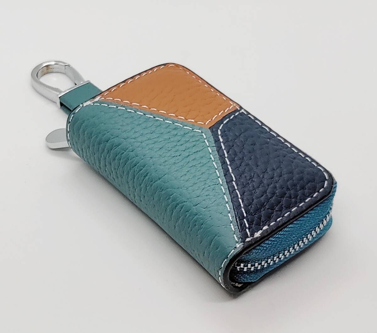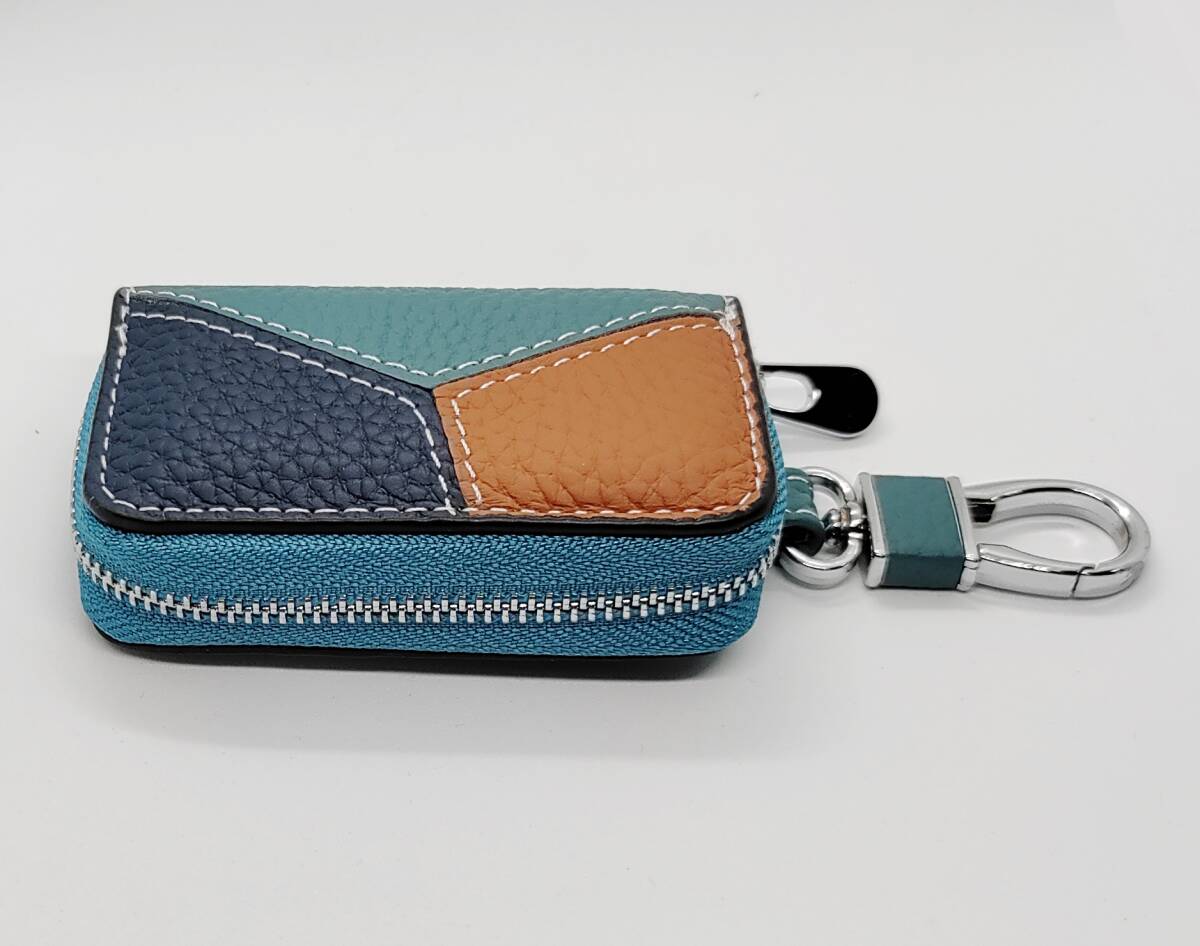 キーケース ★新品・未使用品 本革 レザー スマートキー キーホルダー 鍵 キーチェーン ターコイズブルーxネイビーxブラウン 3色カラー