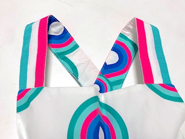 肩紐やウエスト部分のリボン風ストライプがアクセントになり、シルエットはふんわりとしたスカートラインでとても愛らしい印象です。
