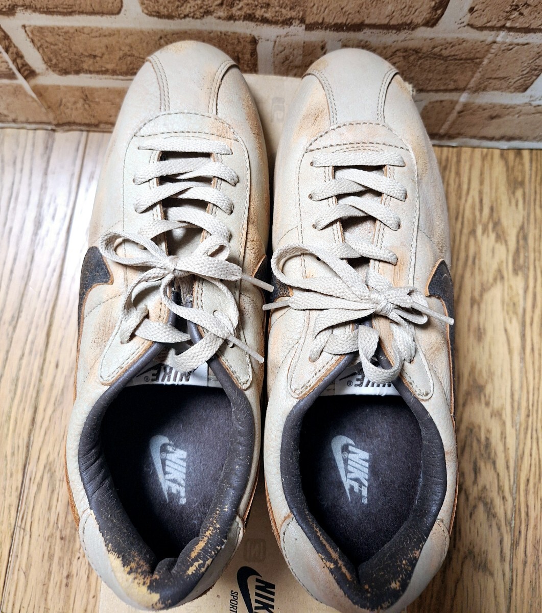 未使用!NIKE ナイキ スニーカー デッドストック レザー コルテッツ ビンテージ加工バージョン ベージュ US11 日本29cm あえて未使用のレザーコルテッツをビンテージ加工に仕上げた珍しいレザーのコルテッツです!私自身は18年位前に高円寺のショップで見つけました!過去のオークションなどでも30000~50000円で落札経歴がある程の珍しいレザーコルテッツです。スニーカーのコレクターの方にお薦めです!ご存知だと思いますがNIKEのスニーカーは表記サイズより0.5~1.0cm小さめですので表記サイズは29cmですが実際は28cm位とイメージして頂きますと問題ありません。ダメージ加工とはいえ、未使用ですのでサイズが合わない、イメージと違うなどの返品は御断り致します。元々、当時の箱はなかったのでNIKEの箱で発送致しますが箱に記載の品番などは違うので御理解下さい。