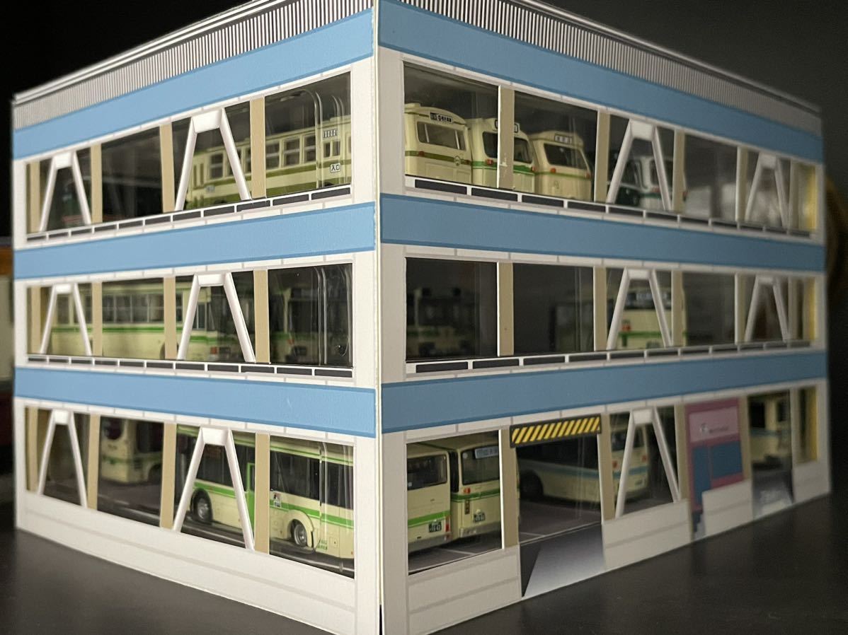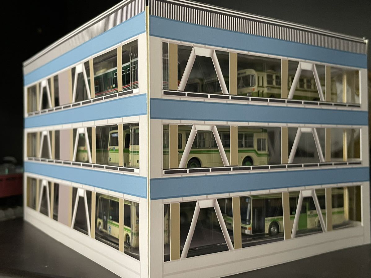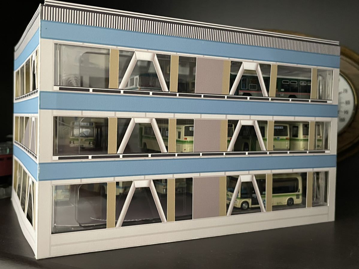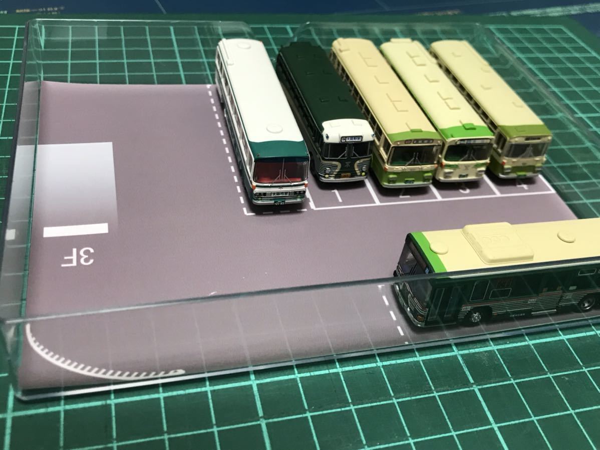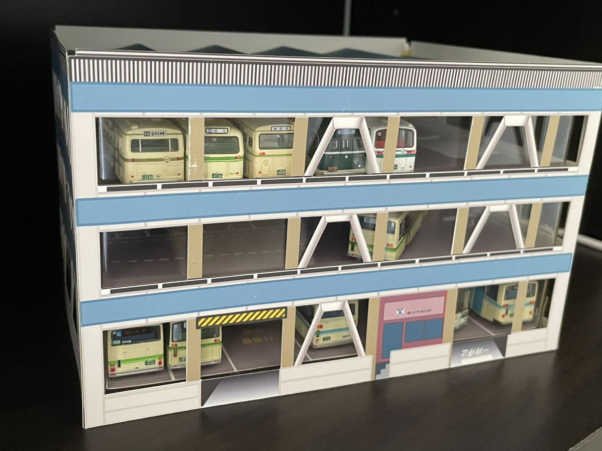 ・透明プラスチック製の3段小物入れ(以下、「本体」という。)を活用し、ご自慢のコレクション(1/150サイズ)を省スペースで飾ることができるよう、立体駐車場風に製図した自作ペーパークラフトです。