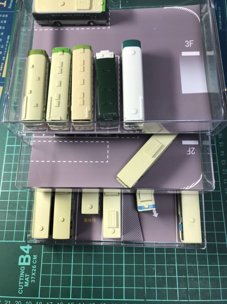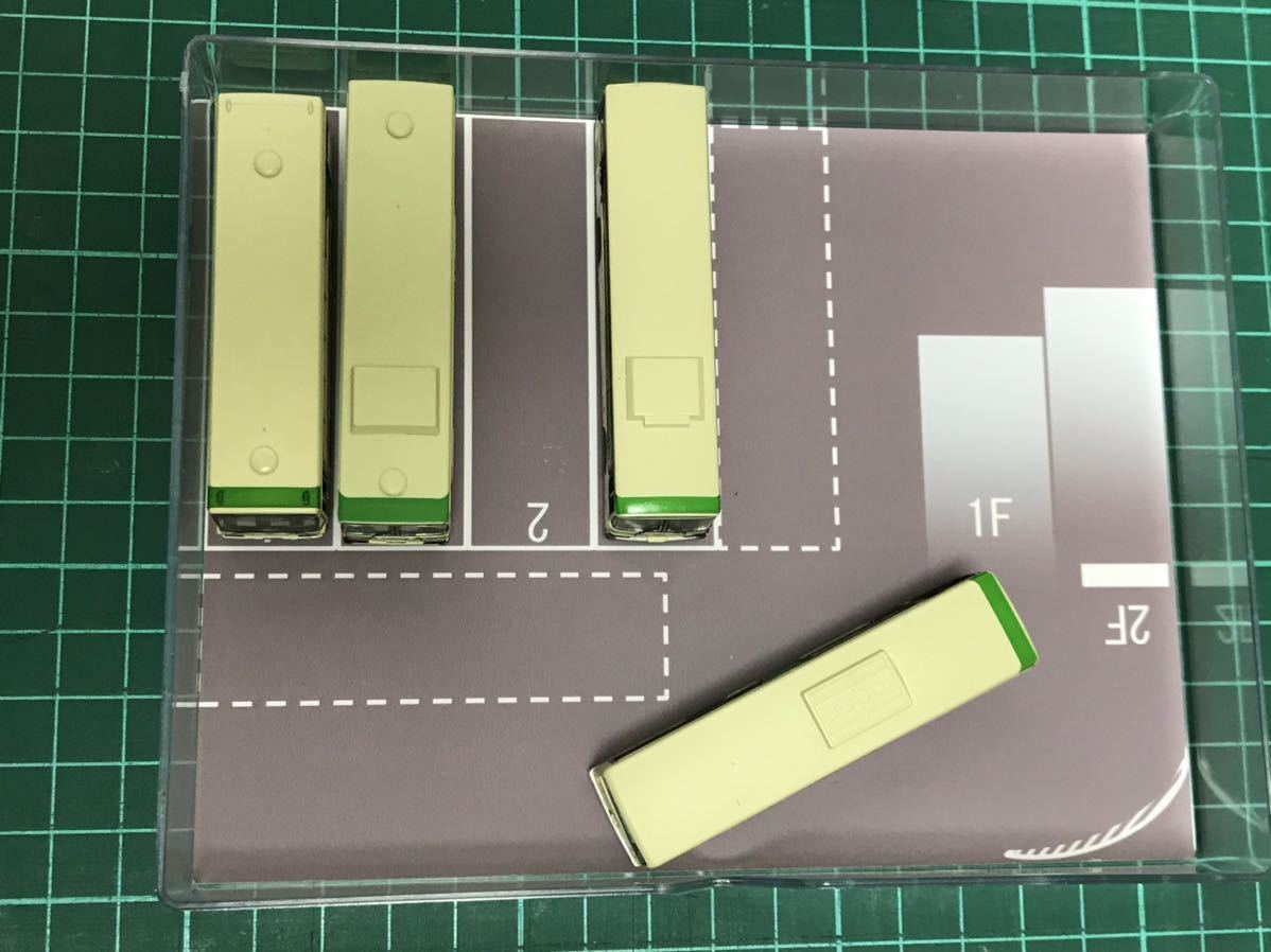 ・本体は引き出し状のもの3段で、各階の床面のシートを本体引き出しの底に敷いてください。車両はその上にセットします。