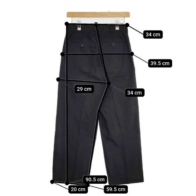 | 実寸サイズ | 総丈:約90.5cm ウエスト:約34cm 股上:約34cm 股下:約59.5cm ヒップ:約39.5cm ワタリ幅:約29cm 裾幅:約20cm ※採寸画像がある商品はハンガーに吊るした状態での計測のため、平置きでの採寸とは差が生じる場合がございます。平置きでの実寸サイズをご希望の場合は、ご購入前に必ずご質問ください。 ※記載以外のサイズが合わないことを理由とした返品はできませんので、 記載部分以外で実寸サイズの気になる箇所があれば必ず購入前にご質問ください。 |