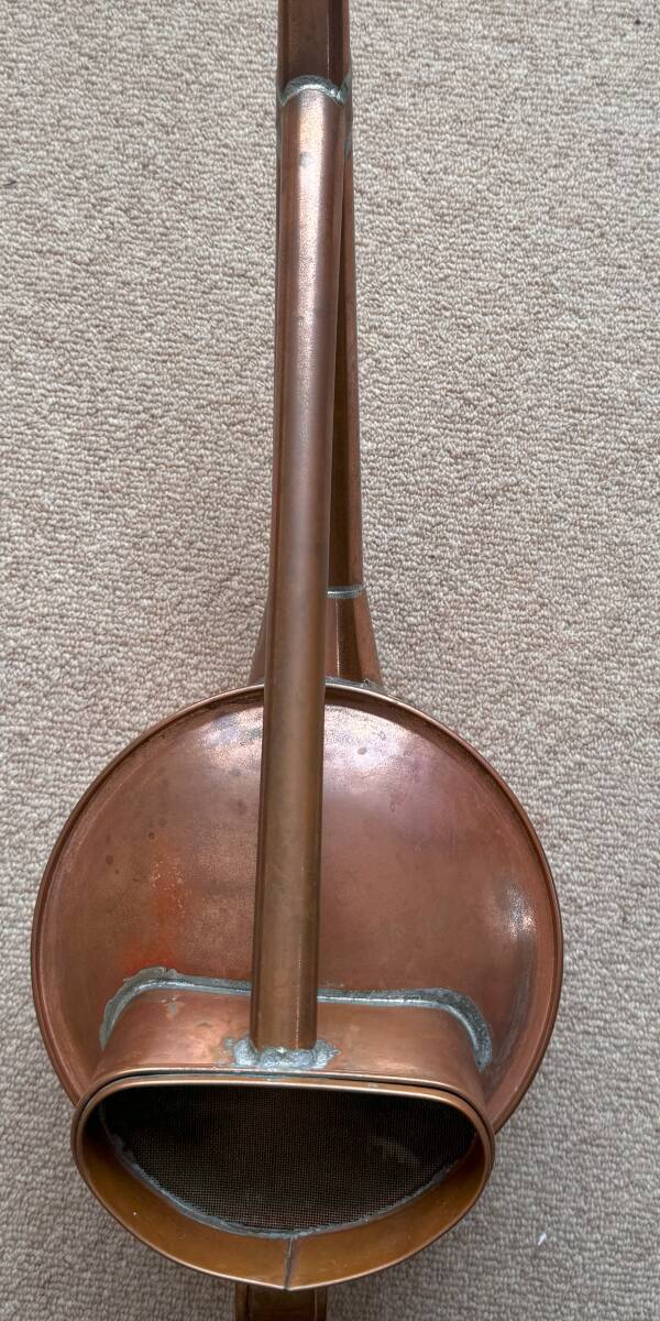手作りで製作されている製品です。ハンダの跡が残っています。銅製なので経年変色しています。ごく小さなへこみや変色むらがあります。全体的には綺麗な状態といえます。ハス口から出る水の細かさは見事です。