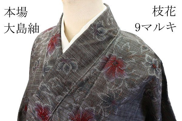 | 【送料無料】未使用品 本場大島紬 9マルキ グレー系 枝花 袷 身丈162.0cm 裄丈64.5cm お洒落 仕立て上がり 正絹 着物フィ m-8089 |