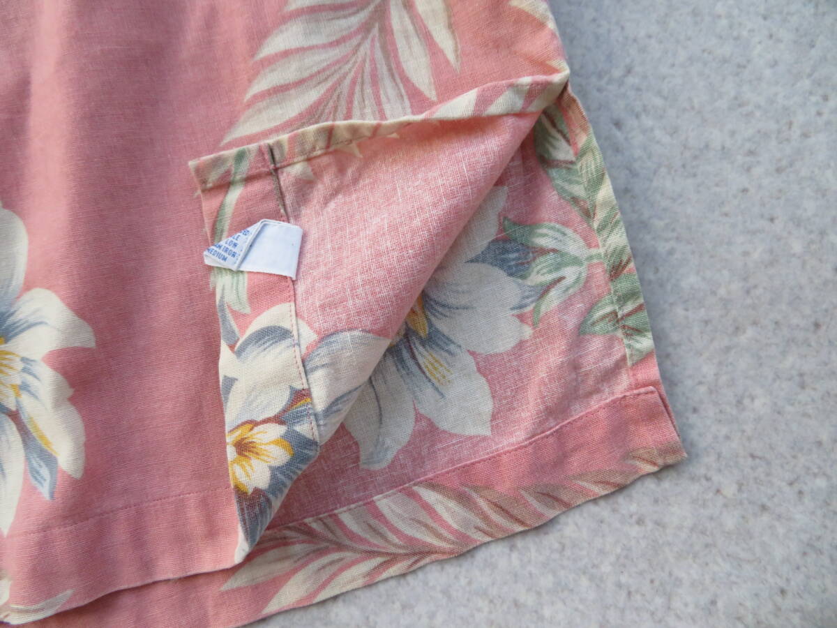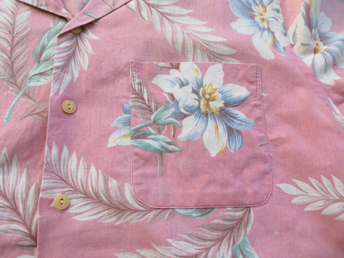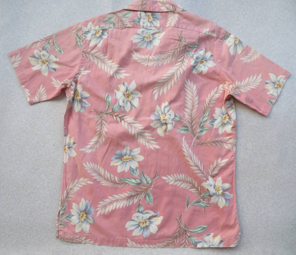 ピーチピンクベースに淡い色味の花柄を全面にプリントされたアロハです。