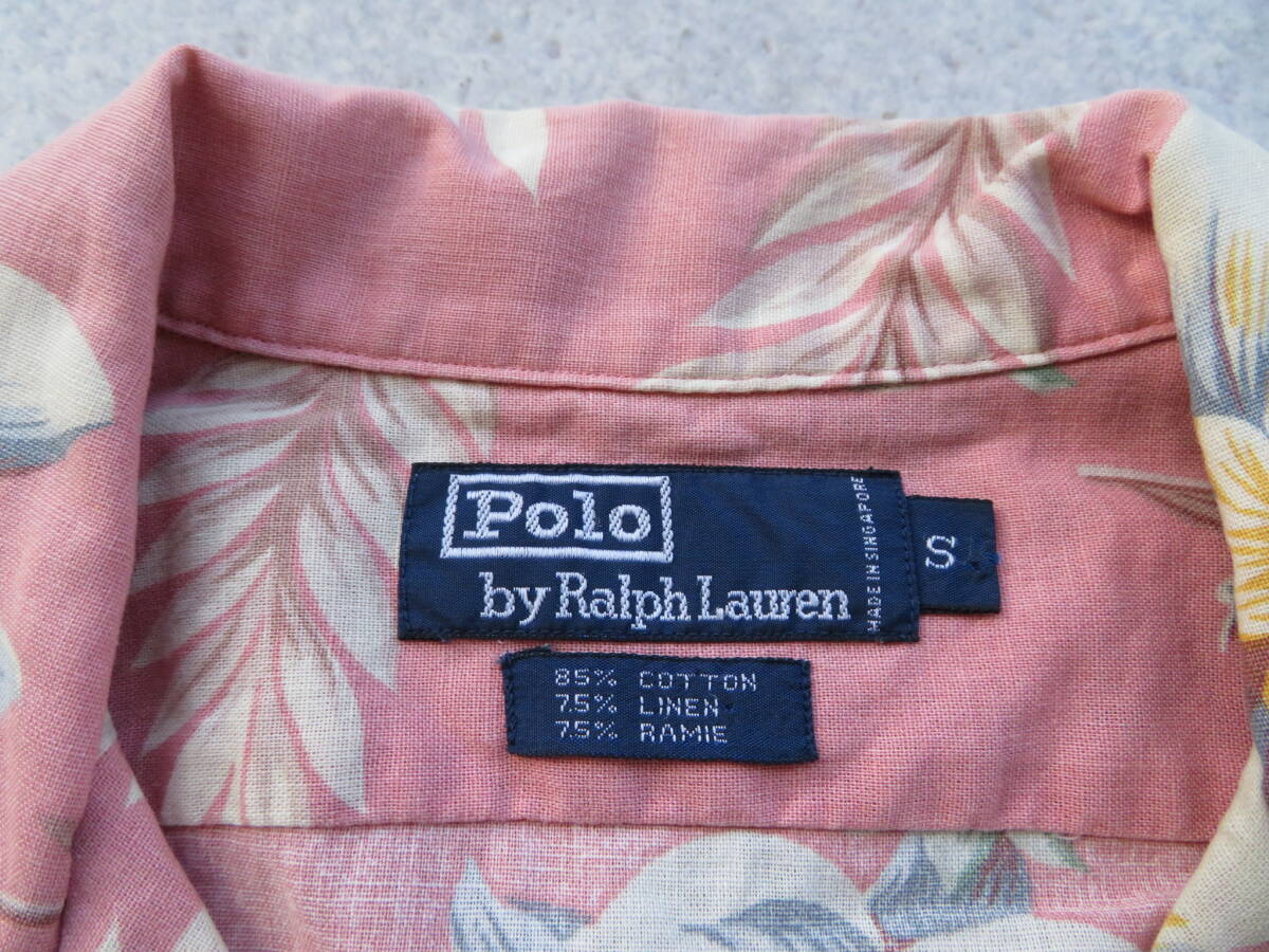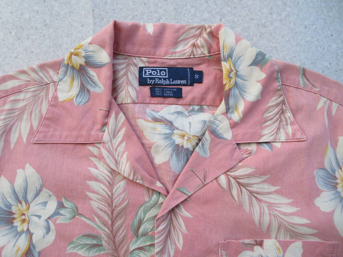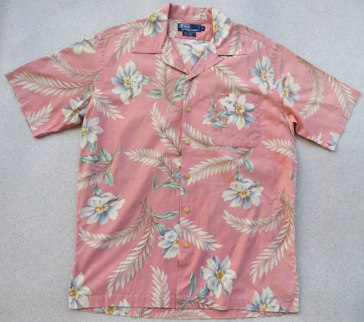 ピーチピンクベースに淡い色味の花柄を全面にプリントされたアロハです。