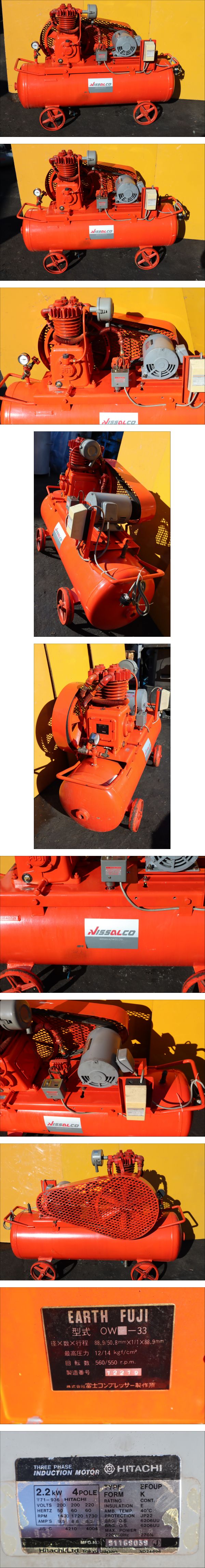 | EARTH FUJI NISSALCO エアーコンプレッサー OW-33 2.2kW(3馬力)三相200V 整備点検済 即決価格 | ||
