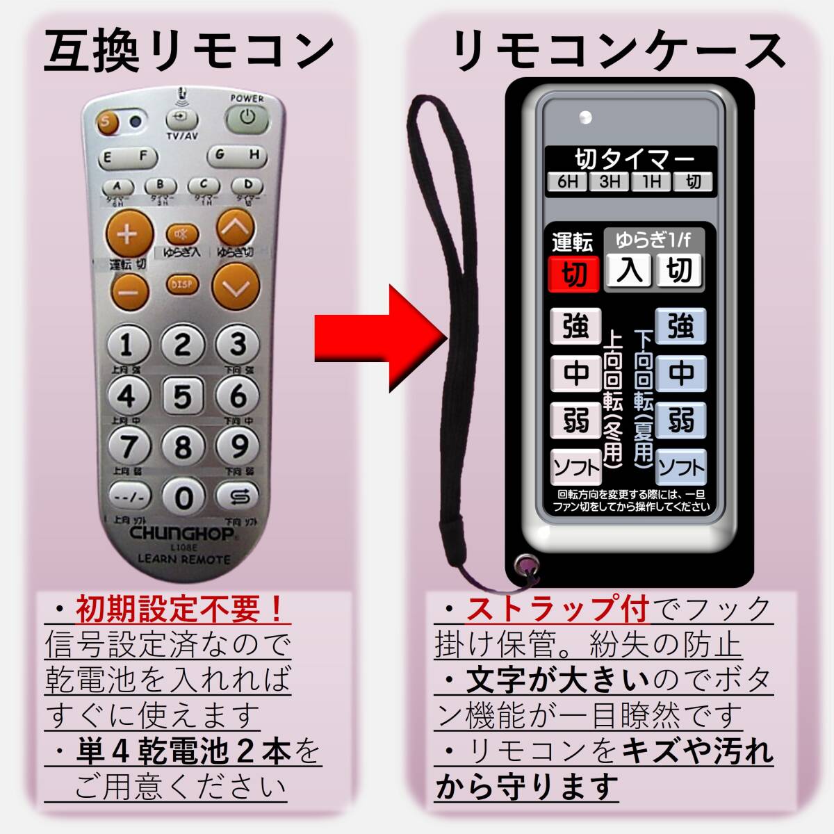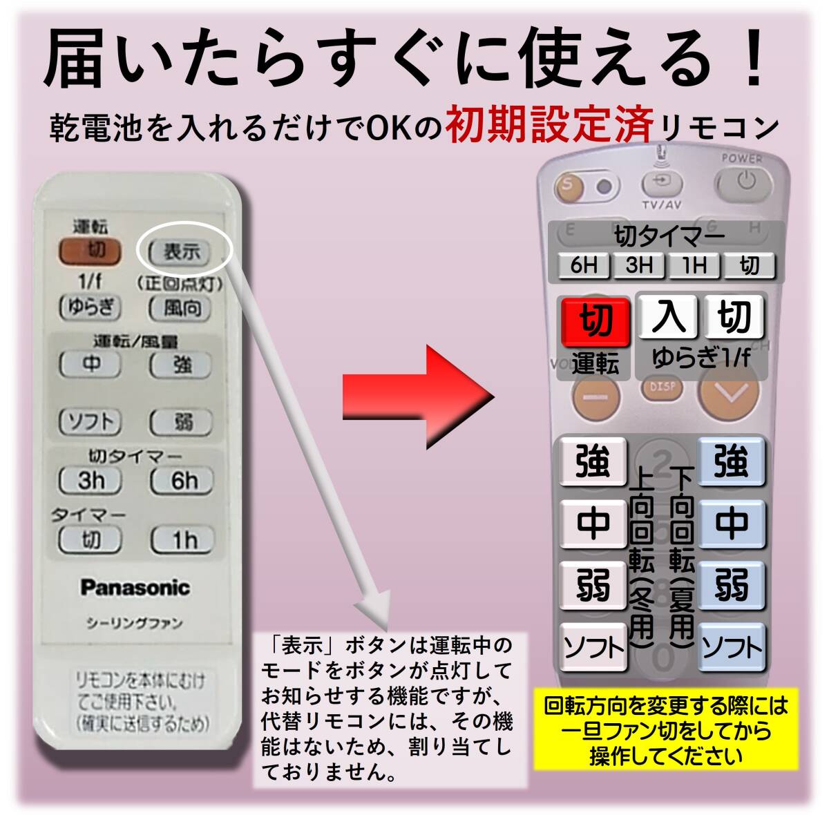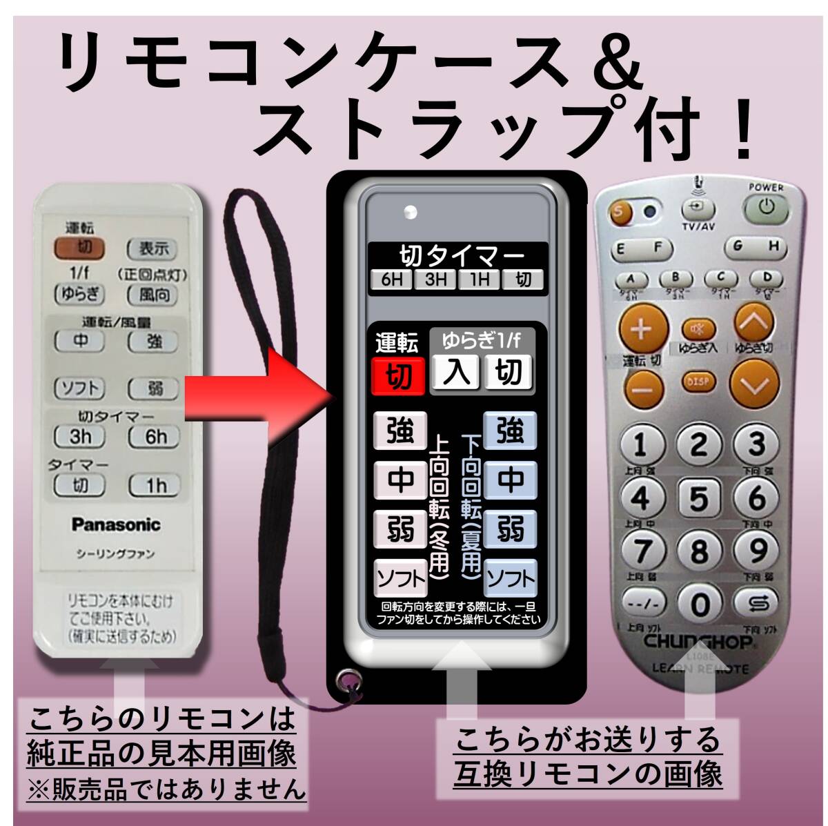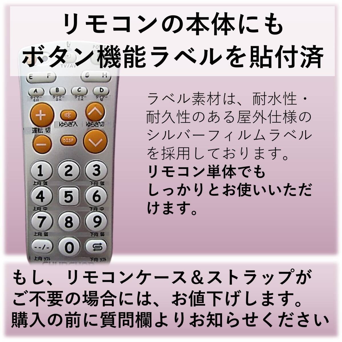【発送について】速やかな発送を心掛けておりますが、発送ができない日もありますので、出荷日情報を必ずご確認ください。 ↓↓リンクを確認↓↓ 最新の出荷日情報(自己紹介コメント欄) ↑↑リンクを確認↑↑ ・日時指定「*月*日着」や「*日まで必着」等はお受けできません。 ・自己紹介ページ記載の予定で出荷しますが、天候・交通状況等の事情で到達が遅れる場合もあります。急用の場合は入札をお控えください。 -------------------------- [送料無料] ・郵便受けに投函となります。到着日時の指定はできません。 ・プチプチ簡易包装の上、クラフト封筒の発送となります。 -------------------------- 【品名】Panasonic FFE2810203 互換 学習リモコン ・リモコンケースとストラップが不要の方は、お値下げしますので、購入前に質問欄よりお知らせください。 -------------------------- 【製品詳細】 ・学習リモコンに上記対応機種の信号を学習させました。信号プログラム済なので、電池をお入れいただければ、このまますぐにお使いいただけます。また電池交換をしても学習内容は消えることはありません。 ・ボタンの機能割り当ては、屋外でも使用できる耐水性のあるフィルムラベルに印字してリモコンに貼付しております。 ・お送りするのは、右側の学習リモコンとなります。左側のリモコンは見本画像となります。 ・新品の学習リモコンベースで作成しておりますが、若干の小キズ等ありますことをご了承ください。 ・リモコン本体のみとなります。乾電池は付属しませんので、別途ご用意ください。 -------------------------- 【手渡し不可】お近くでも商品の手渡しは行っておりません。 -------------------------- 【評価について】評価不要のご依頼が多いので、間違いを防止するため、発送時ではなく後日の評価とさせていただいております。 ・評価ご希望の方→評価を入れてください。後日こちらからもお入れ致します。 ・評価不要の方→評価は入れないでください。当方へ評価があるとこちらからも入ってしまいます。ご注意ください。 -------------------------- | ||||||||||||||||