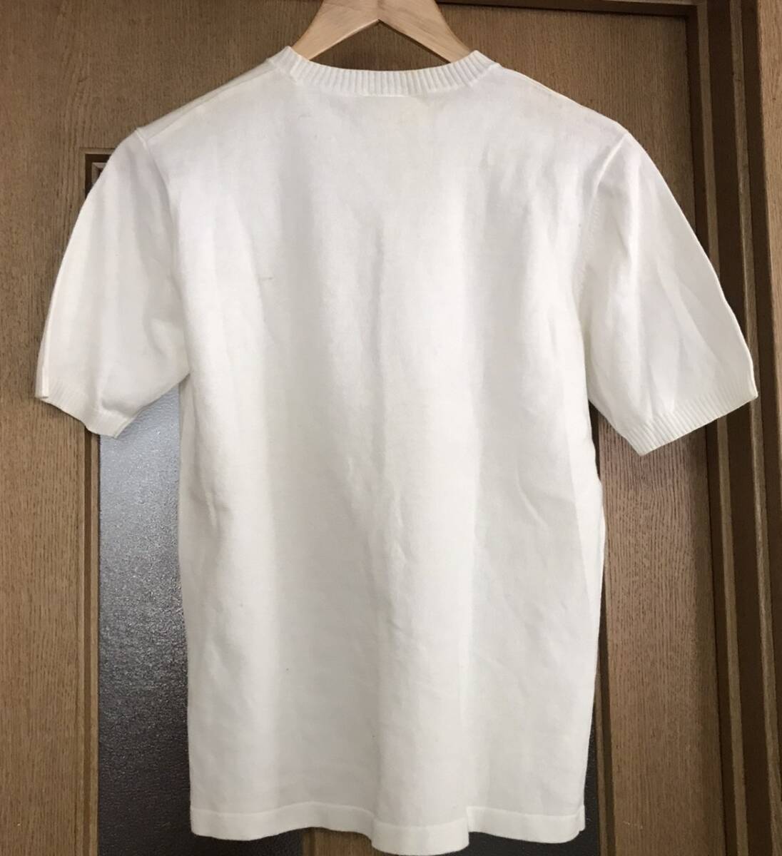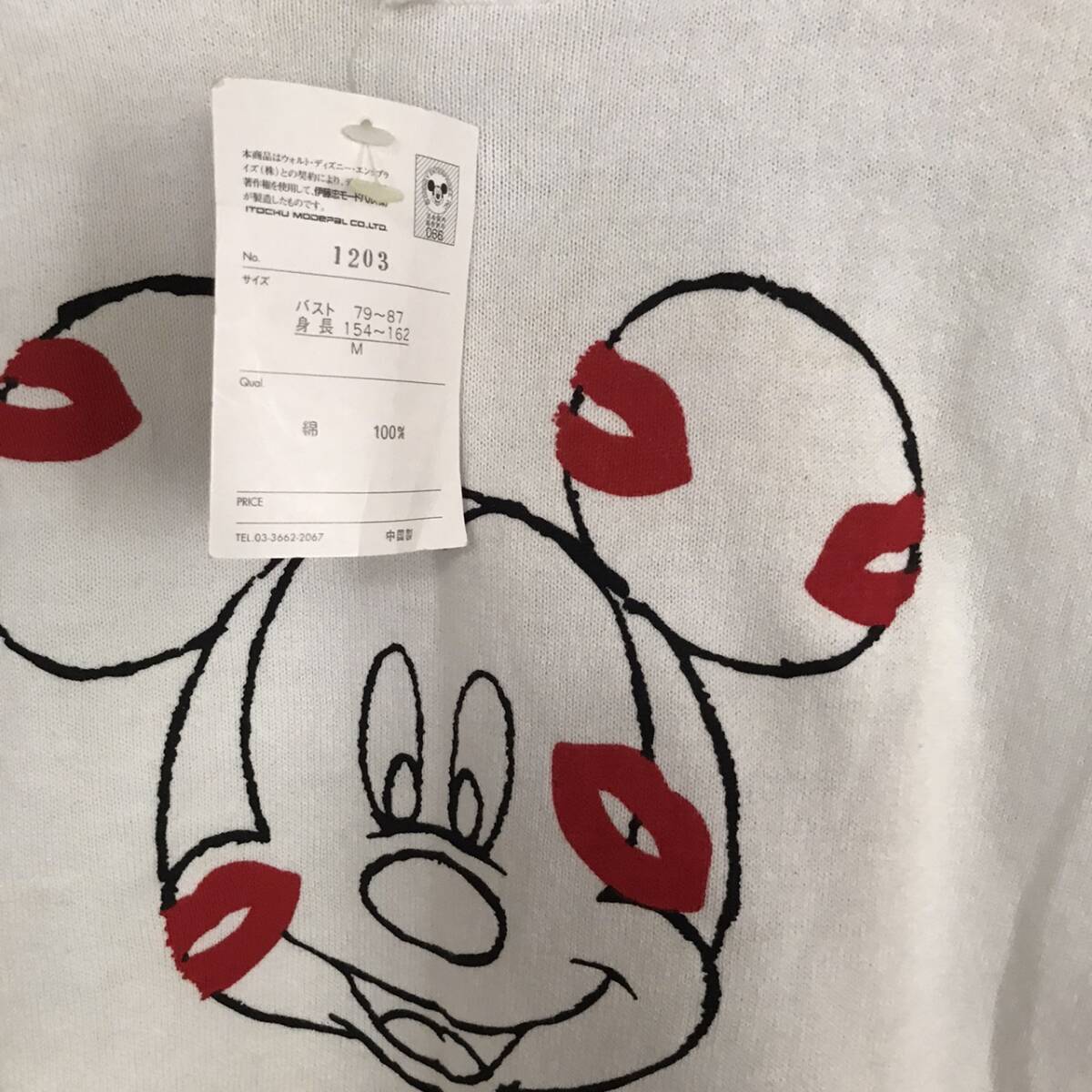 ミッキーのTシャツ サマーセーターです。たぶんミニーからのキスマーク?を付けられて、幸せそうなミッキーの顔のシャツです。綿100%レディースM白~オフホワイト新品ですが 素人保管のため撮影の色味 サイズの誤差 初期キズ等 ご了承いただける方のみ ご購入 お願いいたします。発送は郵便局のゆうパックまたはヤフネコを 予定しております。