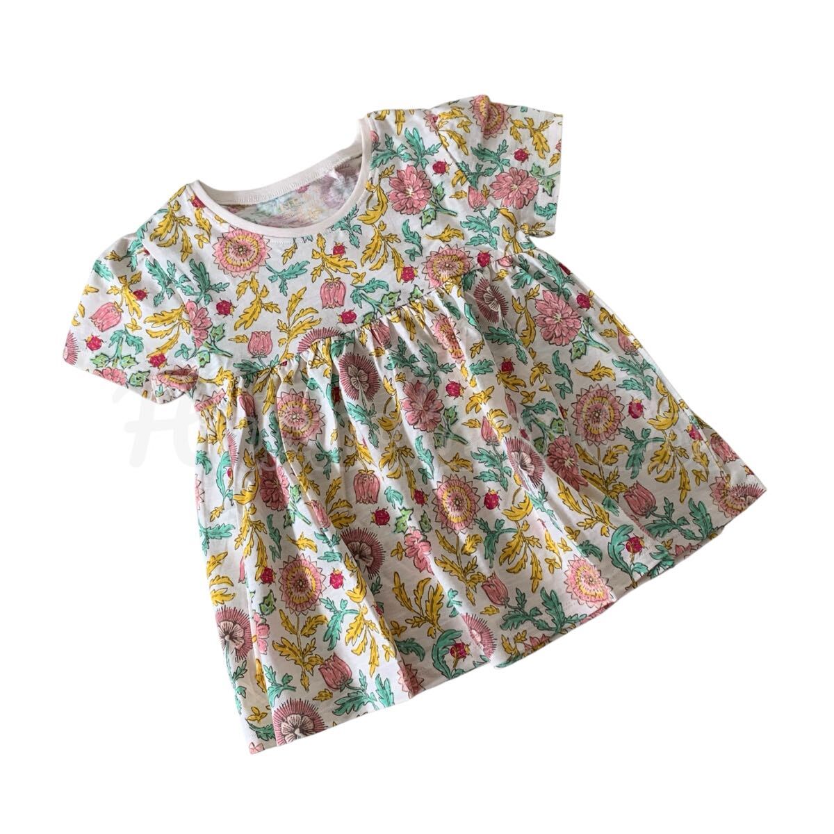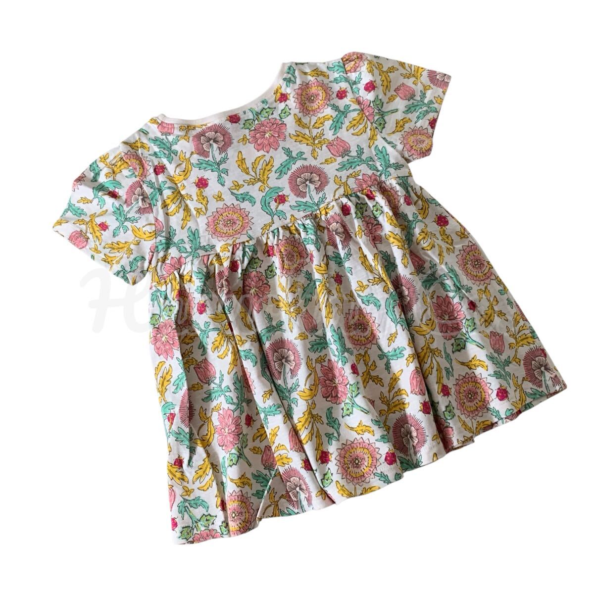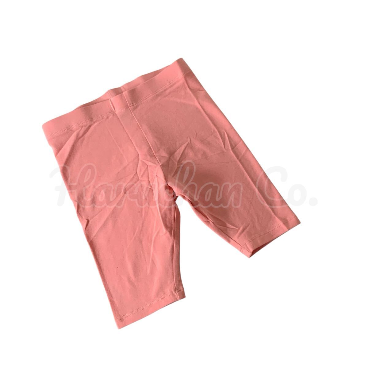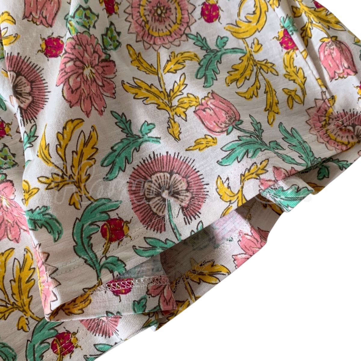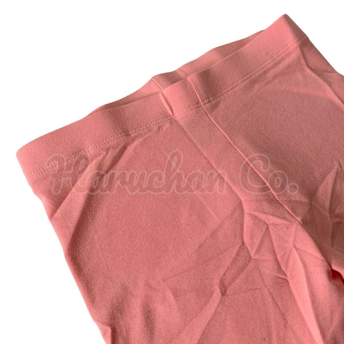 クラシカルでエレガントな花柄のフレアトップスと、コーラルオレンジのレギンスのセット