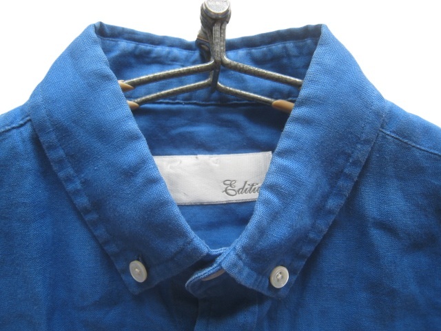高級日本製!!トゥモローランド エディション TOMORROWLAND Edition*ロゴ刺繍 麻100% 7分袖リネンボタンダウンシャツ 1 実寸M 青 ブルー