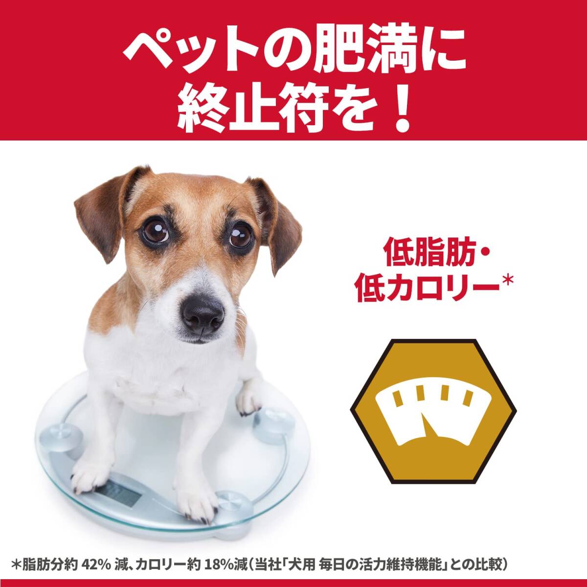 | 商品説明 | カロリーを抑えてお腹を満たし、健康な適正体重の維持をサポートする食物繊維 厳選されたナチュラルな原材料を使用したドッグフード。チキンが第一原材料。合成着色料・香料不使用。 健康で丈夫な骨と筋肉を保つたんぱく質とカルニチン 科学的根拠に裏付けされた抗酸化成分(ビタミンE+C)が愛犬本来の健康な免疫力の維持をサポート 原材料:チキン、大麦、トウモロコシ、小麦、エンドウマメブラン、コーングルテン、マイロ、セルロース、チキンエキス、植物性油脂、ビートパルプ、亜麻仁、ポークエキス、小麦ブラン、オート麦ファイバー、リンゴ、ブロッコリー、ニンジン、クランベリー、エンドウマメ、ミネラル類(カルシウム、ナトリウム、カリウム、クロライド、銅、鉄、マンガン、セレン、亜鉛、ヨウ素)、乳酸、アミノ酸類(タウリン、リジン)、ビタミン類(A、B1、B2、B6、B12、C、D3、E、ベータカロテン、ナイアシン、パントテン酸、葉酸、ビオチン、コリン)、酸化防止剤(ミックストコフェロール、ローズマリー抽出物、緑茶抽出物)、カルニチン 米国の獣医師が推奨するペットフードNo.1※CM Research社調べ。サイエンス・ダイエットブランドとして 原産国:アメリカ合衆国 脂肪分約42%オフ、カロリー約18%オフ(当社「犬用 毎日の活力維持機能」との比較) 肥満が気になる柴犬、コーギー、ゴールデンレトリバー、ラブラドールなどの中/大型犬の身体の様々な機能を栄養学の観点からサポートする「機能性健康食」 保証成分値:たんぱく質20.0%以上、脂質5.5%以上、10.0%以下、粗繊維14.0%以下、灰分6.5%以下、水分10.5%以下