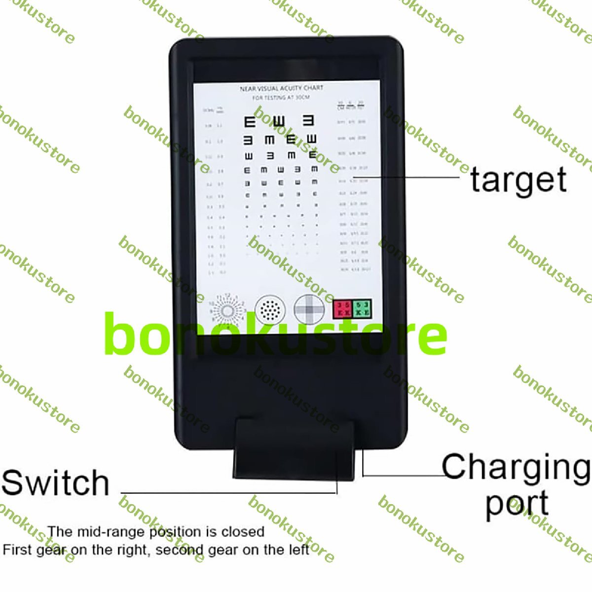 説明する: 5タイプの視覚標準検出:eシンボル、乱視記号、セルシンボル、クロスシンボル、レッドグリーンシンボル。 検眼環境の変化に応じて、適切な明るさを選択できます。これは、主に高視線と老視の検出に近い視力検査に適しています。 仕様: 名前:検眼チャート 素材:プラスチック 視力は、白い背景の平均輝度を示しています:80-320CD、平方メートル 視覚視力輝度の均一性:?0.85 出力電圧:4.2V 0.5a 録音ビジョン方法:小数録音/5ポイント録音 パッケージ重量:1.5 kg サイズ:213*120*15mm パッケージが含まれます: 視力チャートビジョンテスター*1