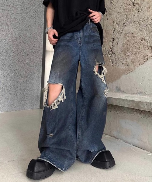 キーワード:ジーンズ メンズ ストレート ダメージデニム ハイウエスト フルレングス ワイドパンツ 無地