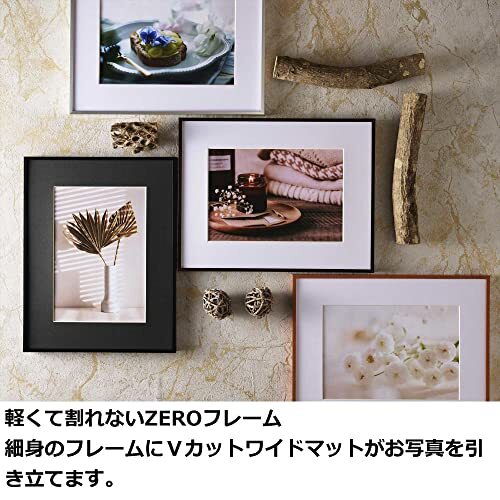 軽くて割れないZEROフレーム。 前面板はガラスを使っていないので従来の額縁より軽くて割れる心配もないので安心です。 細身のフレームにVカットワイドマットが、お写真を引き立てます。(Vカット:中抜きの断面を斜めにカットして、お写真までの奥行きを引き立てる加工方法) コーナーおさえ補助金具(4個入)が付属しています。フレームとマットのコーナーの浮きが気になる方は、同封の説明書をよく読みコーナー補助金具をお使いください。